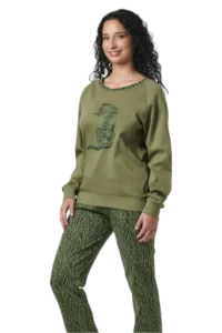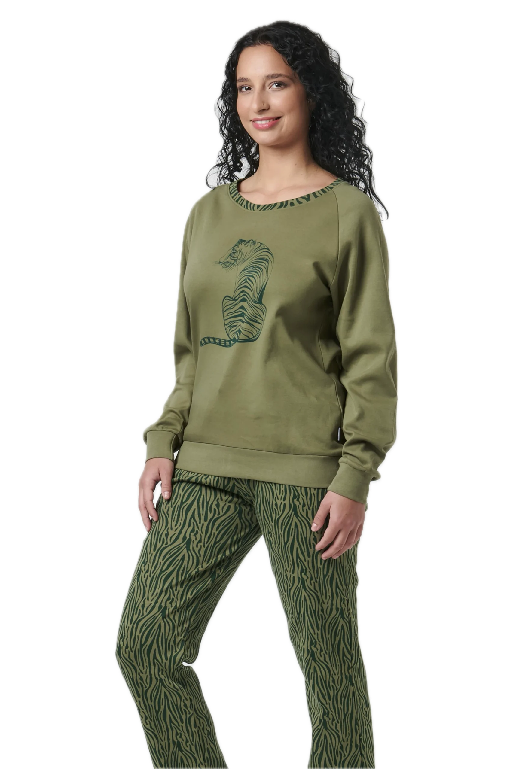 Γυναικεία πιτζάμα apple. Το σετ περιλαμβάνει μακρυμάνικη μπλούζα με μανσέτες στα μανίκια και παντελόνι ζεβρέ.