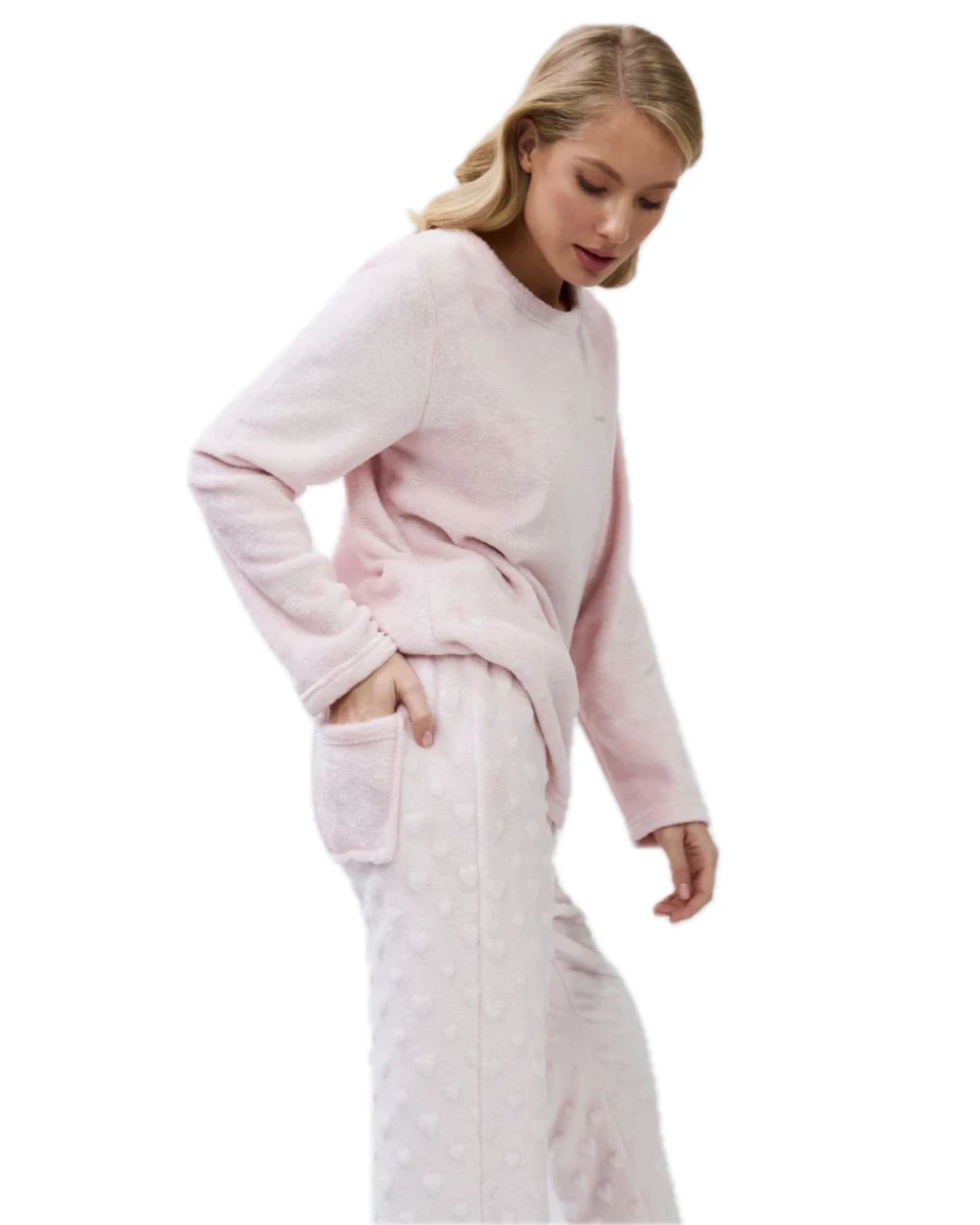Γυναικεία πιτζάμα Aruelle Liara fleece. Το σετ περιλαμβάνει μακρυμάνικη μπλούζα και παντελόνα με λάστιχο μέσης και ίσιο τελείωμα. Η Aruelle σχεδιάζει ξεχωριστές δημιουργίες με αγάπη και πάθος για τις γυναίκες που αναζητούν την άνεση αλλά και το στυλ μέσα στο σπίτι.