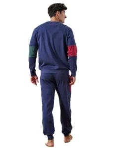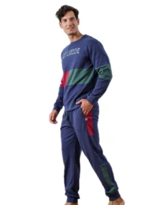 Η ανδρική πιτζάμα Guy Laroche με δίχρωμη ρίγα συνδυάζει κομψότητα, ποιότητα και απόλυτη άνεση. Η μπλούζα, σε σκούρο μπλε χρώμα, διαθέτει οριζόντια δίχρωμη ρίγα και το λογότυπο Guy Laroche στο στήθος, προσθέτοντας μια διακριτική αλλά ξεχωριστή πινελιά στο σχέδιο. Το παντελόνι είναι σκούρο μπλε, με κορδόνι στη μέση, πρακτικές τσέπες και λάστιχο στο τελείωμα για σταθερή και άνετη εφαρμογή