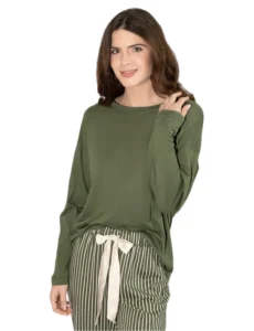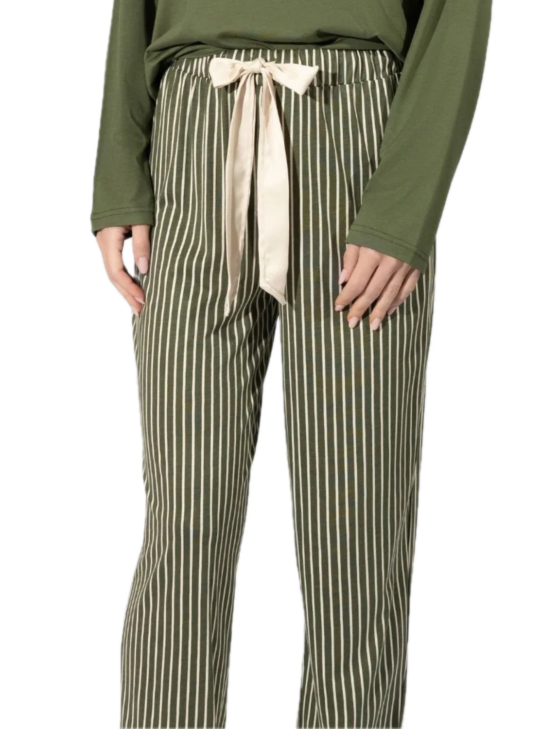 Ανακαλύψτε το απόλυτο σετ homewear που συνδυάζει στυλ και άνεση για τις χαλαρές σας στιγμές στο σπίτι. Το σετ περιλαμβάνει ένα μακρυμάνικο μπλουζάκι σε λαδί απόχρωση και παντελόνι με ριγέ σχέδιο σε αποχρώσεις του πράσινου και του μπεζ με σατέν κορδόνι στη μέση για άψογη εφαρμογή, προσφέροντας στυλ και άνεση για όλες τις ώρες του σπιτιού.