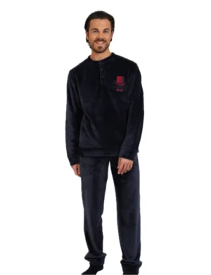 Ανδρική fleece πιτζάμα με πατιλέτα, από την Lydia Creations. Το σετ αποτελείται από μονόχρωμη μπλούζα με κουμπιά πατιλέτα και μονόχρωμο παντελόνι σε ίσια γραμμή με περιμετρικό λάστιχο στην μέση για πιο σταθερό κράτημα.