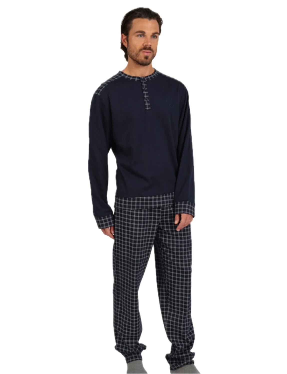 Ανδρική πιτζάμα με πατιλέτα, από την Lydia Creations. Το σετ αποτελείται από μονόχρωμη μπλούζα με κουμπιά πατιλέτα και κεντημένο σχέδιο και καρό παντελόνι σε ίσια γραμμή με περιμετρικό λάστιχο στην μέση για πιο σταθερό κράτημα.