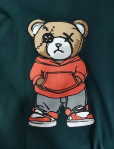 Ανδρική πιτζάμα με μοτίβο αρκουδάκι. Αποτελείται από μακρυμάνικη μονόχρωμη μπλούζα με στρόγγυλη λαιμόκοψη και τύπωμα μπροστά και μονόχρωμο παντελόνι με μπάσκα στο τελείωμα.