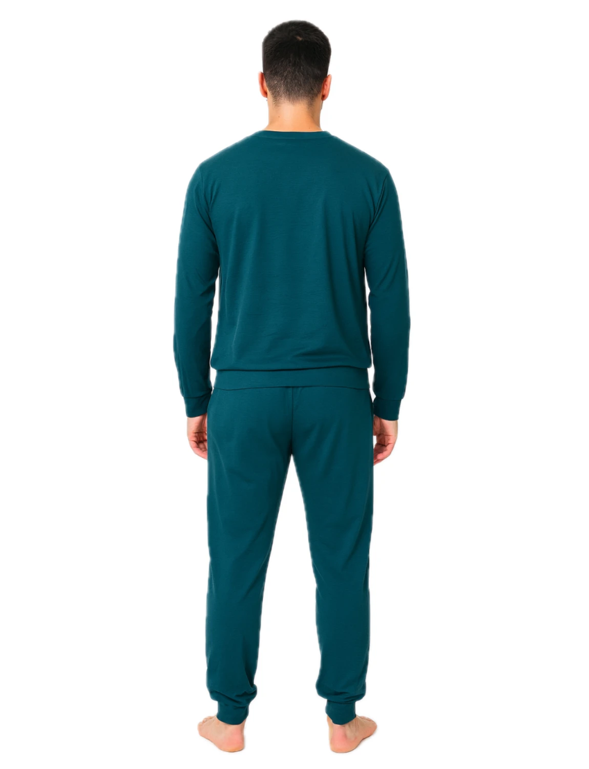 Ανδρική πιτζάμα με μοτίβο αρκουδάκι. Αποτελείται από μακρυμάνικη μονόχρωμη μπλούζα με στρόγγυλη λαιμόκοψη και τύπωμα μπροστά και μονόχρωμο παντελόνι με μπάσκα στο τελείωμα.