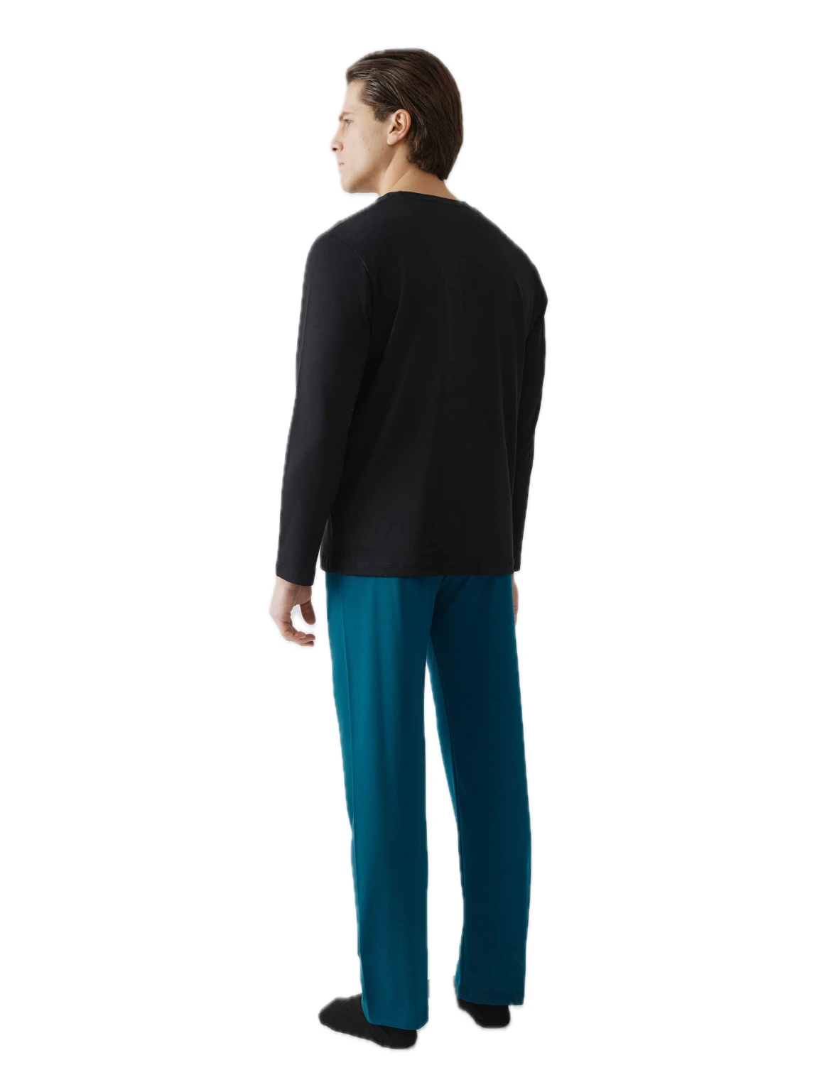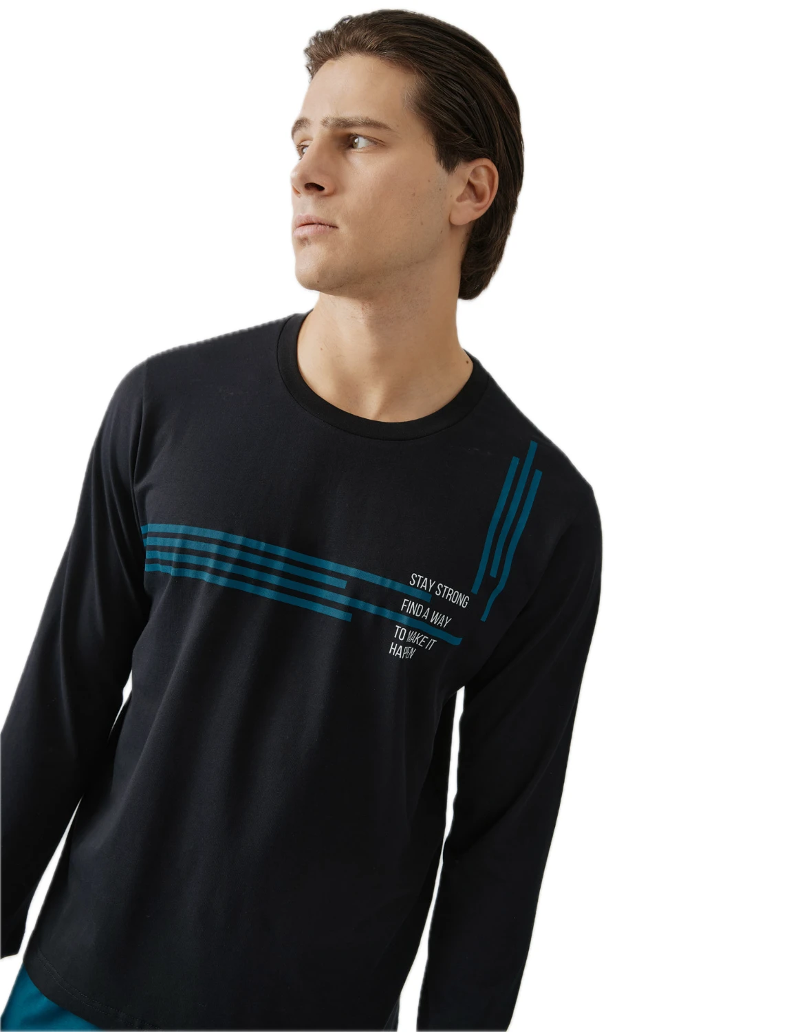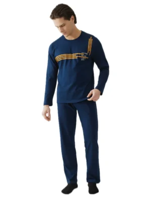 Ανδρική πιτζάμα από βαμβακερό ύφασμα υψηλής ποιότητας. Αποτελείται από μακρυμάνικη μονόχρωμη μπλούζα με στρόγγυλη λαιμόκοψη και τύπωμα μπροστά και μονόχρωμο παντελόνι με ίσιο τελείωμα.