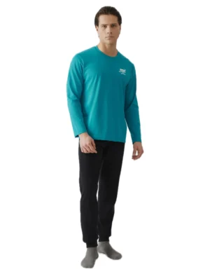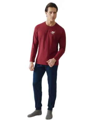 Ανδρική πιτζάμα από βαμβακερό ύφασμα υψηλής ποιότητας. Αποτελείται από μακρυμάνικη μονόχρωμη μπλούζα με στρόγγυλη λαιμόκοψη και τύπωμα μπροστά και πίσω και μονόχρωμο παντελόνι με μπάσκα στο τελείωμα.