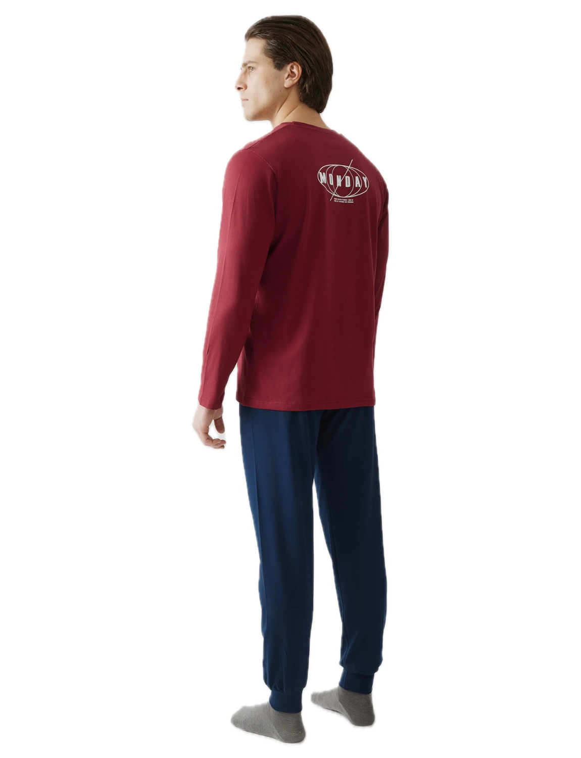 Ανδρική πιτζάμα από βαμβακερό ύφασμα υψηλής ποιότητας. Αποτελείται από μακρυμάνικη μονόχρωμη μπλούζα με στρόγγυλη λαιμόκοψη και τύπωμα μπροστά και πίσω και μονόχρωμο παντελόνι με μπάσκα στο τελείωμα.