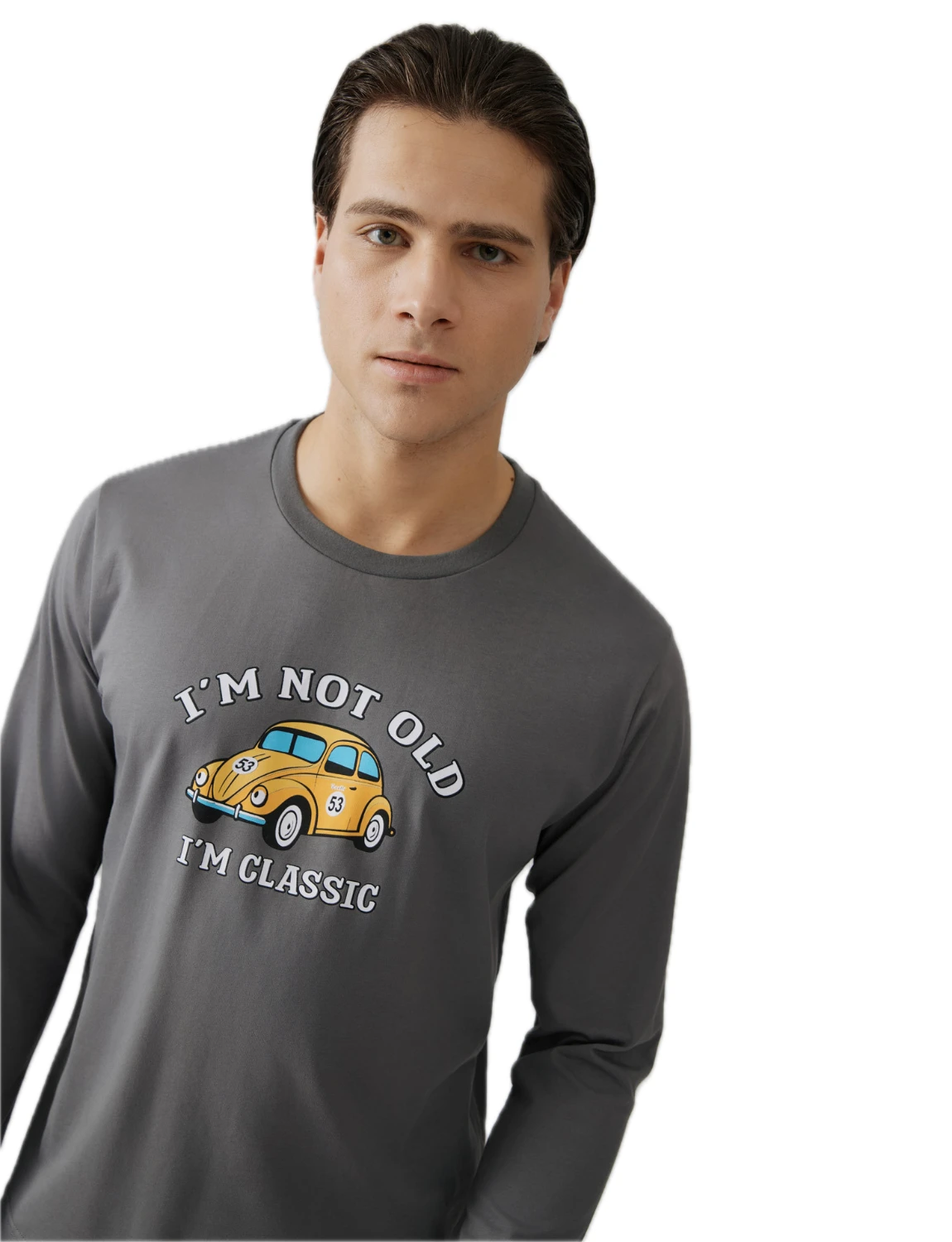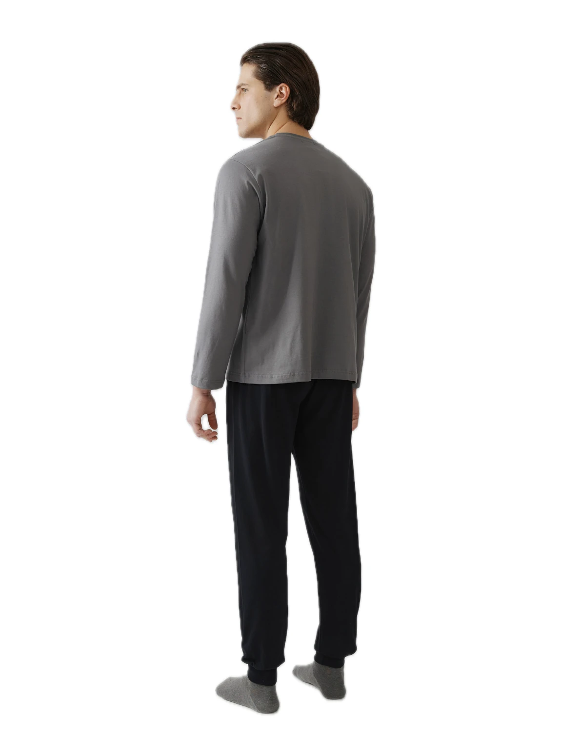 Ανδρική πιτζάμα από βαμβακερό ύφασμα υψηλής ποιότητας. Αποτελείται από μακρυμάνικη μονόχρωμη μπλούζα με στρόγγυλη λαιμόκοψη και τύπωμα μπροστά και μονόχρωμο παντελόνι με μπάσκα στο τελείωμα.