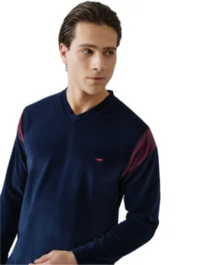 Χειμερινή πιτζάμα βελούδινη. To σετ περιλαμβάνει μπλούζα με V λαιμόκοψη και παντελόνι με μπάσκες στα τελειώματα.
