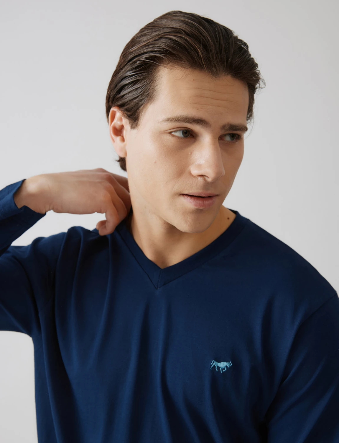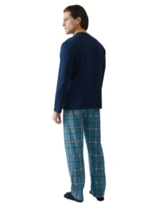 Ανδρική πιτζάμα από βαμβακερό ύφασμα υψηλής ποιότητας. Αποτελείται από μακρυμάνικη μονόχρωμη μπλούζα με V λαιμόκοψη και καρό παντελόνι με λάστιχο στη μέση και ίσιο τελείωμα.