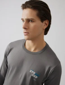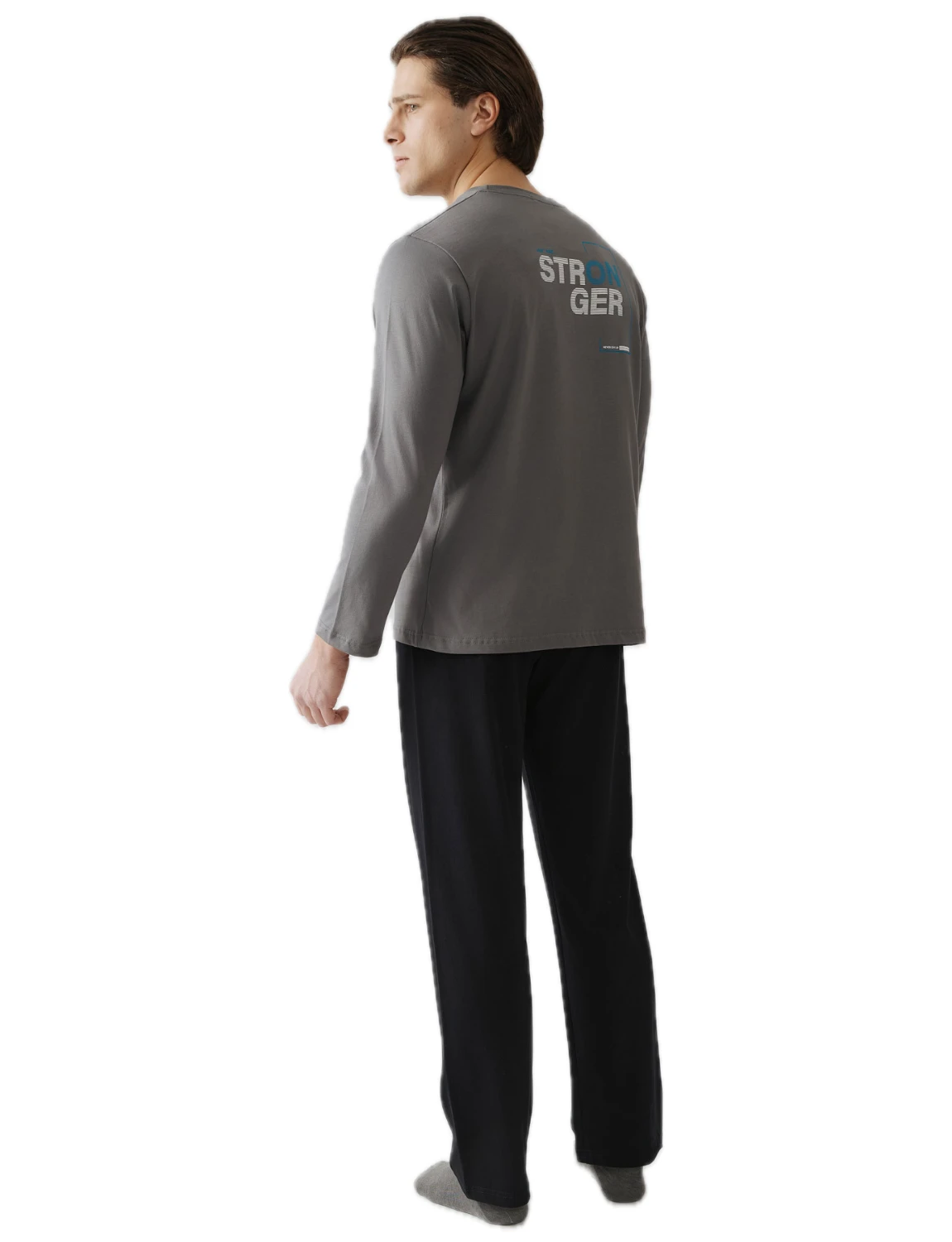 Ανδρική πιτζάμα από βαμβακερό ύφασμα υψηλής ποιότητας. Αποτελείται από μακρυμάνικη μονόχρωμη μπλούζα με στρόγγυλη λαιμόκοψη και τύπωμα μπροστά και πίσω και μονόχρωμο παντελόνι με ίσιο τελείωμα.