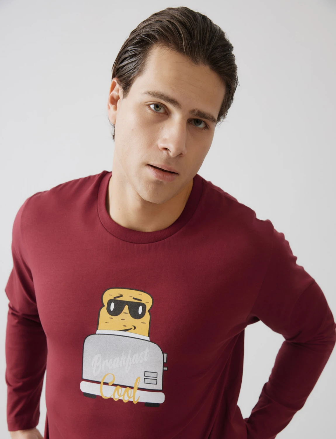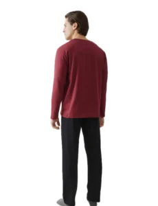 Ανδρική πιτζάμα από βαμβακερό ύφασμα υψηλής ποιότητας. Αποτελείται από μακρυμάνικη μονόχρωμη μπλούζα με στρόγγυλη λαιμόκοψη και τύπωμα μπροστά και μονόχρωμο παντελόνι με ίσιο τελείωμα.