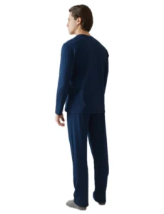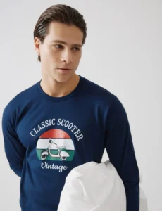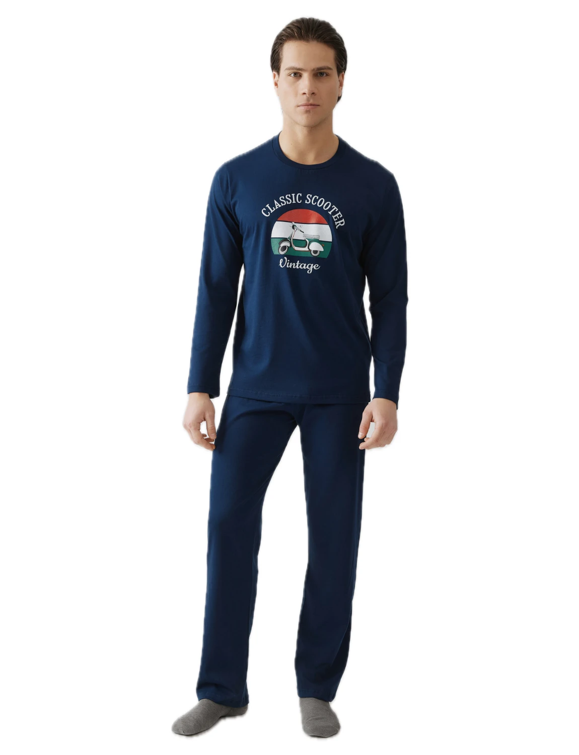 Ανδρική πιτζάμα από βαμβακερό ύφασμα υψηλής ποιότητας. Αποτελείται από μακρυμάνικη μονόχρωμη μπλούζα με στρόγγυλη λαιμόκοψη και τύπωμα μπροστά και μονόχρωμο παντελόνι με ίσιο τελείωμα.