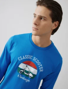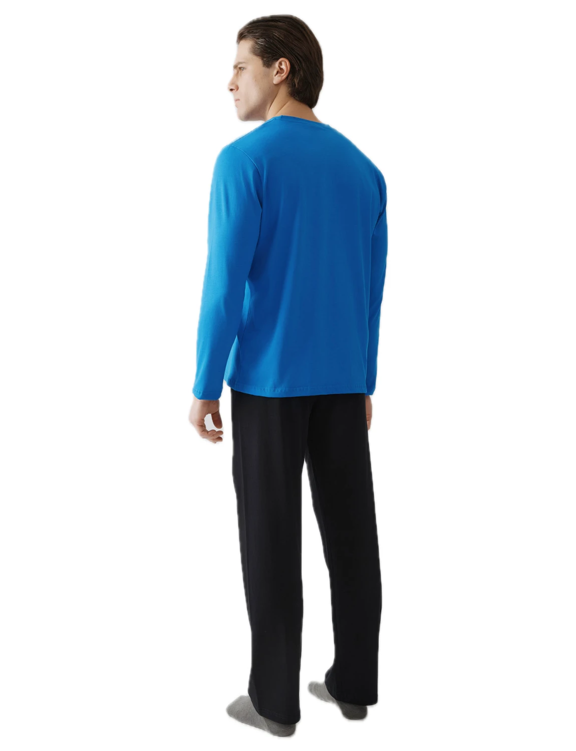 Ανδρική πιτζάμα από βαμβακερό ύφασμα υψηλής ποιότητας. Αποτελείται από μακρυμάνικη μονόχρωμη μπλούζα με στρόγγυλη λαιμόκοψη και τύπωμα μπροστά και μονόχρωμο παντελόνι με ίσιο τελείωμα.