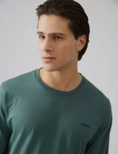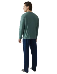 Ανδρική πιτζάμα από βαμβακερό ύφασμα υψηλής ποιότητας. Αποτελείται από μακρυμάνικη μονόχρωμη μπλούζα με στρόγγυλη λαιμόκοψη και μονόχρωμο παντελόνι με ίσιο τελείωμα.