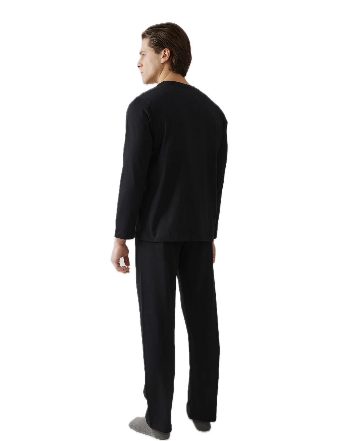Ανδρική plus size πιτζάμα από βαμβακερό ύφασμα υψηλής ποιότητας. Αποτελείται από μακρυμάνικη μονόχρωμη μπλούζα με στρόγγυλη λαιμόκοψη και τύπωμα μπροστά και μονόχρωμο παντελόνι με ίσιο τελείωμα.