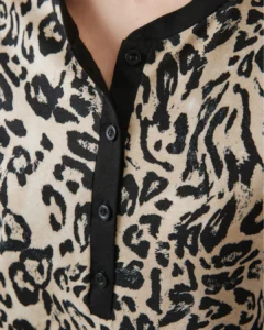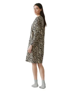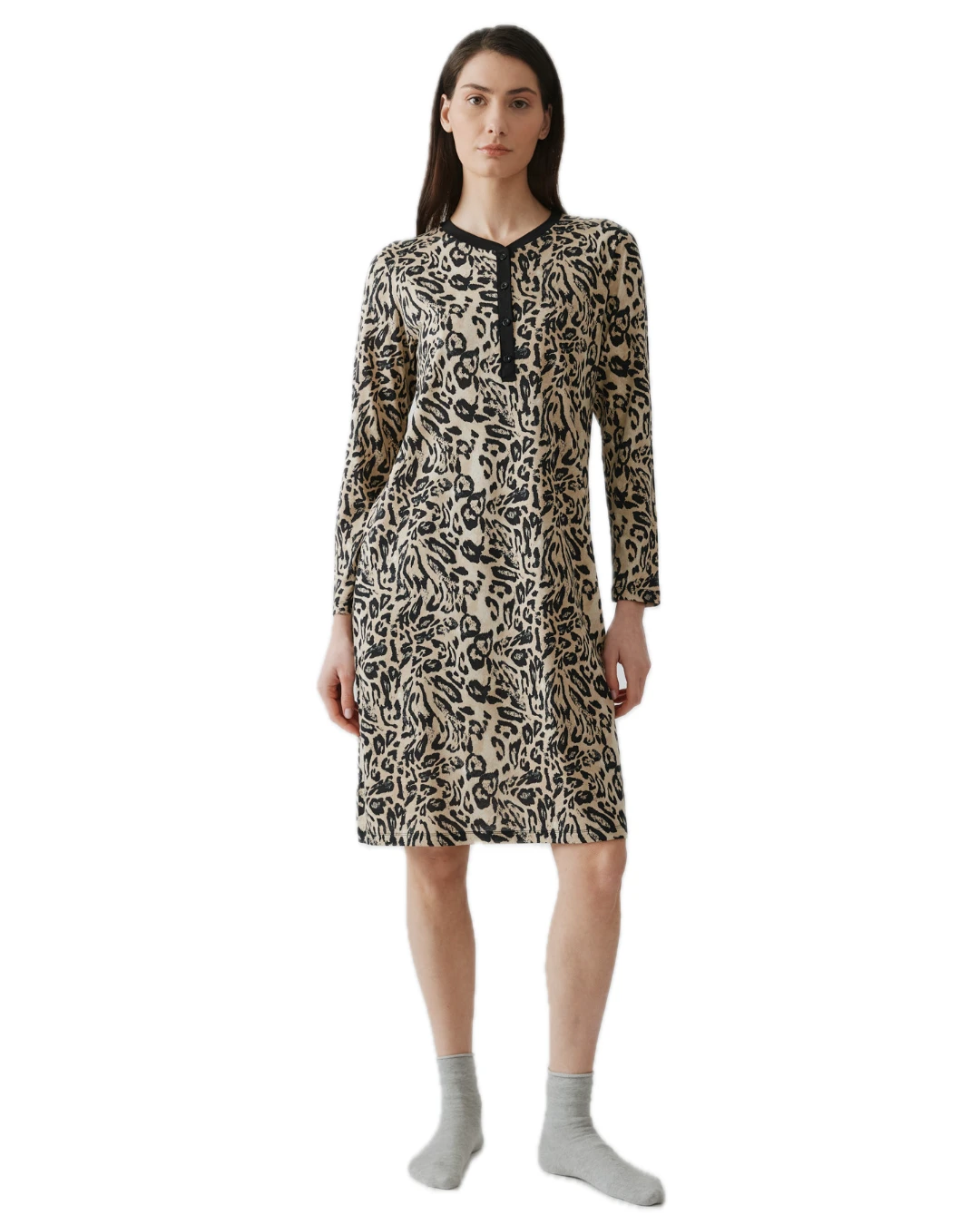 Χειμερινό νυχτικό από μοντάλ και βαμβάκι υψηλής ποιότητας, τυπωμένο all over. Η μίξη αυτών των δύο φυσικών ινών προσδίδει ένα εξαιρετικό αποτέλεσμα. Έχει κλειστή λαιμόκοψη, με πατιλέτα και κουμπιά και μήκος στο γόνατο.