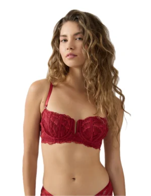 Balconette σουτιέν με μπανέλα, και ρυθμιζόμενες, αφαιρούμενες τιράντες, Έχει χαμηλή κοπή που αναδεικνύει το ντεκολτέ, με κάθετες ραφές στα cups για επιπλέον στήριξη και σχήμα. Το σχέδιο στο κέντρο και η δαντέλα το κάνουν πιο αισθησιακό. Προσφέρει καλή στήριξη και φυσικό όγκο, και είναι ιδανικό για πιο θηλυκές εμφανίσεις ή για ιδιαίτερες περιστάσεις.