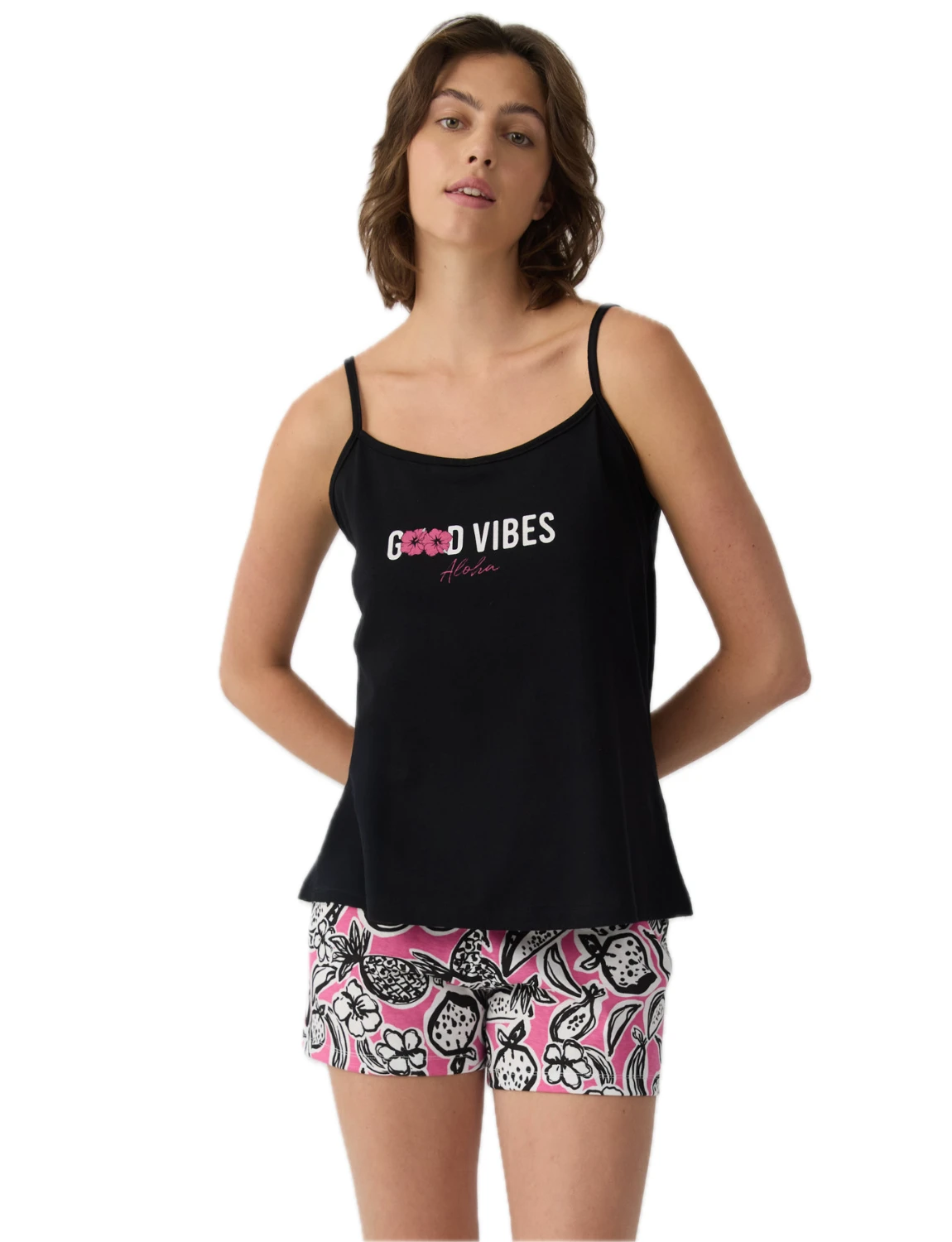 Σετ πιτζάμας από βαμβάκι εξαιρετικής ποιότητας που προσφέρει απαλή αίσθηση και άνεση κατά τη διάρκεια του ύπνου. Το σετ αποτελείται από τοπ με λεπτές μπριτέλες και διακοσμητικό τύπωμα στο στήθος, καθώς και κοντό εμπριμέ σορτς με ελαστική μέση για σταθερή και άνετη εφαρμογή. Ιδανική επιλογή για δροσερές και άνετες καλοκαιρινές νύχτες.