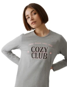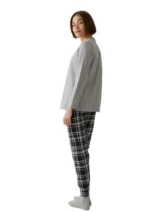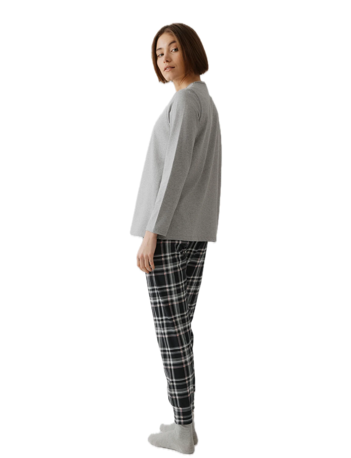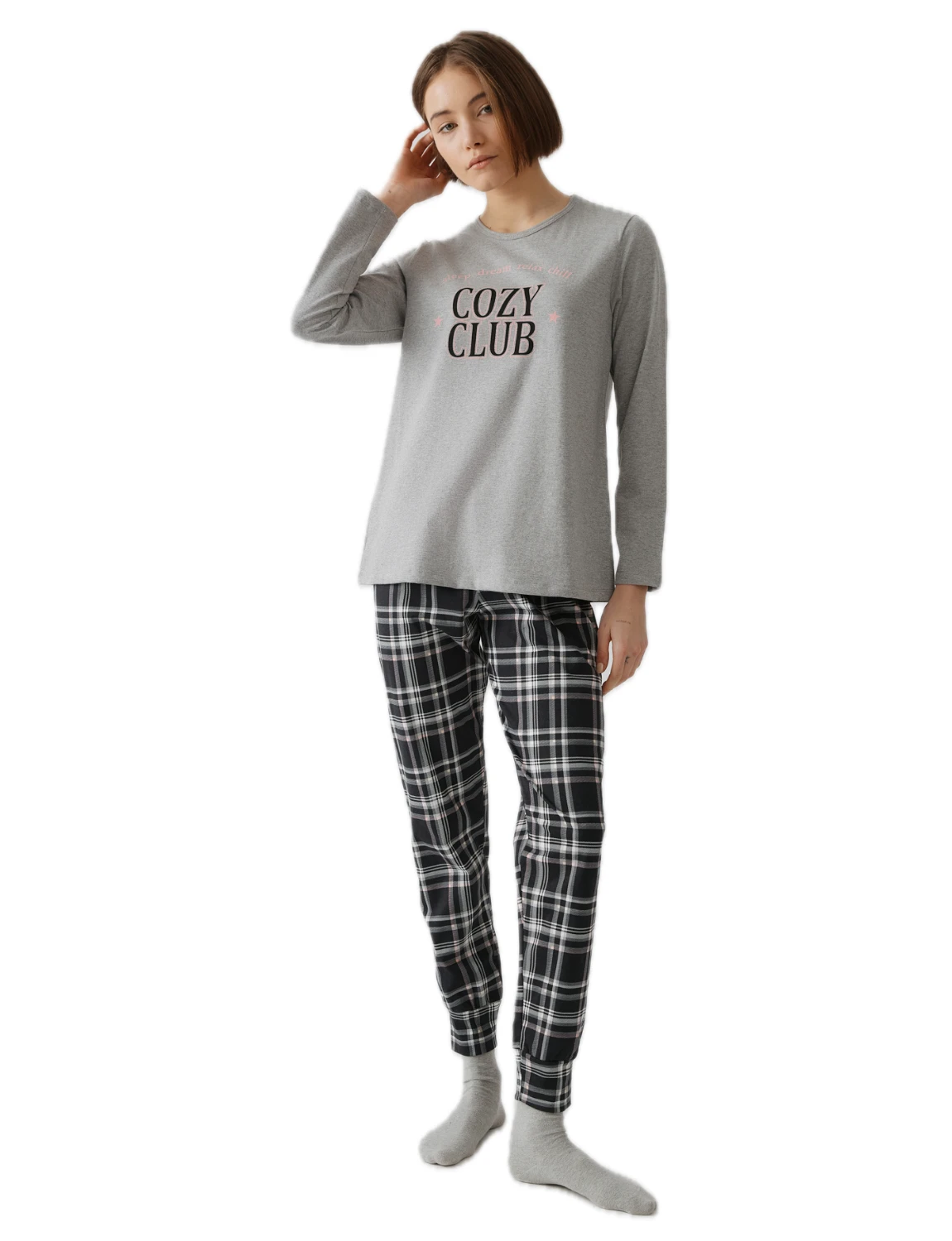Γυναικεία πιτζάμα από βαμβακερό ύφασμα υψηλής ποιότητας. Αποτελείται από μακρυμάνικη μπλούζα με στρόγγυλη λαιμόκοψη και τύπωμα μπροστά και καρό παντελόνι με μπάσκα στο τελείωμα.