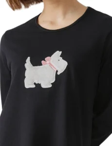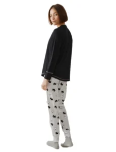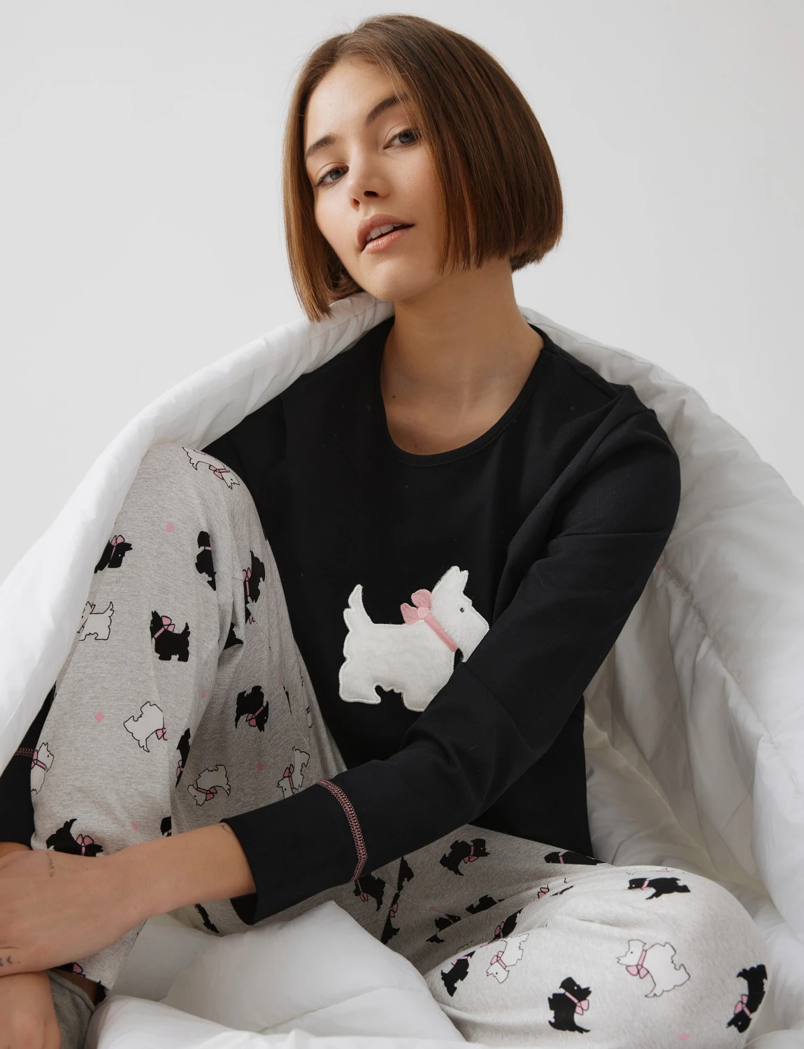 Γυναικεία πιτζάμα από βαμβακερό ύφασμα υψηλής ποιότητας. Αποτελείται από μακρυμάνικη μπλούζα με στρόγγυλη λαιμόκοψη και ανάγλυφο σχέδιο μπροστά και allover παντελόνι με μπάσκα στο τελείωμα.