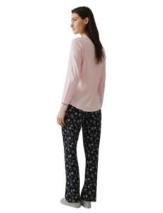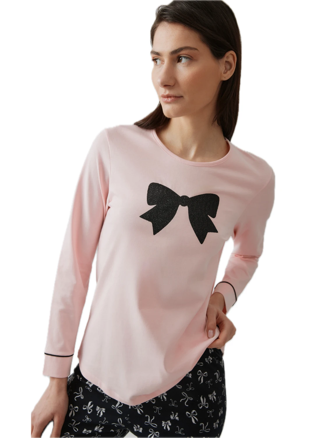 Γυναικεία πιτζάμα από βαμβακερό ύφασμα υψηλής ποιότητας. Αποτελείται από μακρυμάνικη μπλούζα με στρόγγυλη λαιμόκοψη, τύπωμα μπροστά με λάμψη, μπάσκα στο μανίκι και allover παντελόνι με ίσιο τελείωμα.