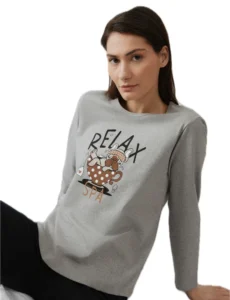 Γυναικεία πιτζάμα από βαμβακερό ύφασμα υψηλής ποιότητας. Αποτελείται από μακρυμάνικη μπλούζα με στρόγγυλη λαιμόκοψη και τύπωμα μπροστά και allover παντελόνι με μπάσκα στο τελείωμα.