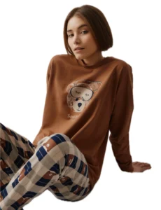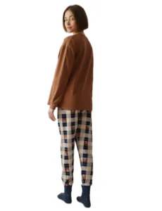 Γυναικεία πιτζάμα από βαμβακερό ύφασμα υψηλής ποιότητας. Αποτελείται από μακρυμάνικη μπλούζα με στρόγγυλη λαιμόκοψη και τύπωμα μπροστά και καρό παντελόνι με μπάσκα στο τελείωμα.