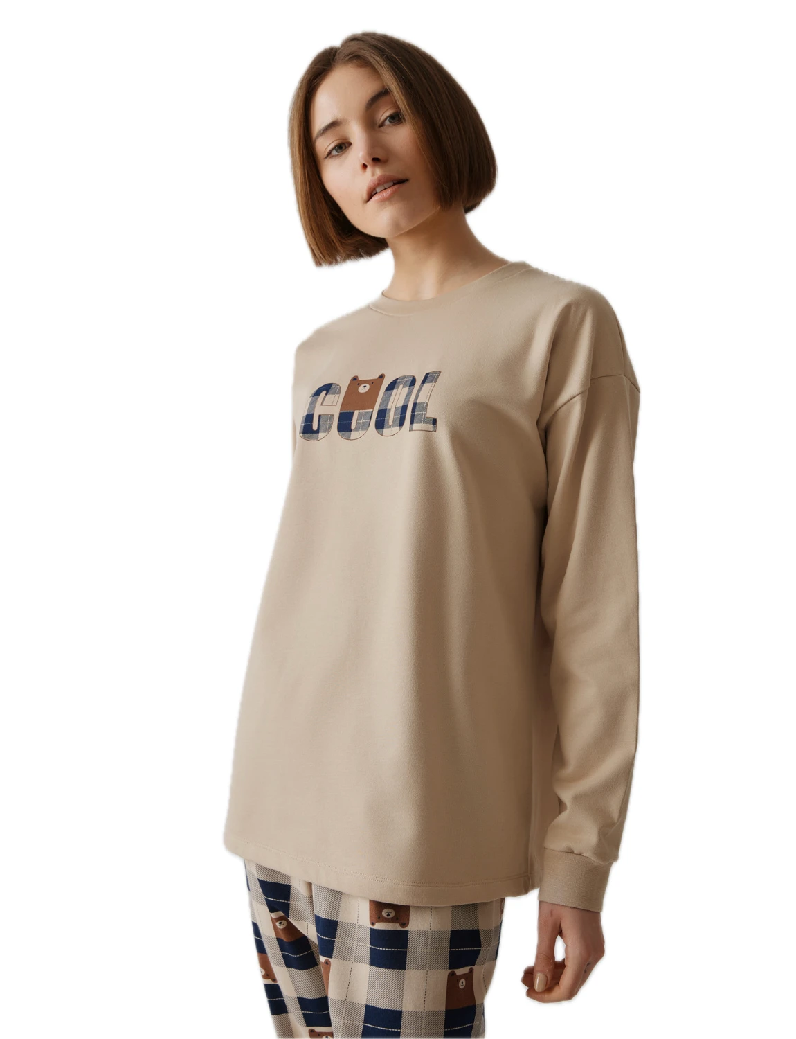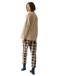 Γυναικεία πιτζάμα από βαμβακερό ύφασμα υψηλής ποιότητας. Αποτελείται από μακρυμάνικη μπλούζα με στρόγγυλη λαιμόκοψη και τύπωμα μπροστά και καρό παντελόνι με μπάσκα στο τελείωμα.