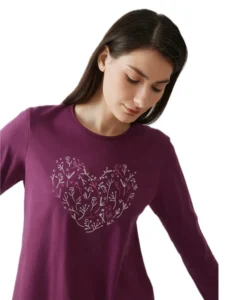 Γυναικεία πιτζάμα από βαμβακερό ύφασμα υψηλής ποιότητας. Αποτελείται από μακρυμάνικη μονόχρωμη μπλούζα με στρόγγυλη λαιμόκοψη και τύπωμα μπροστά, καθώς μονόχρωμο παντελόνι σε ίσια γραμμή.