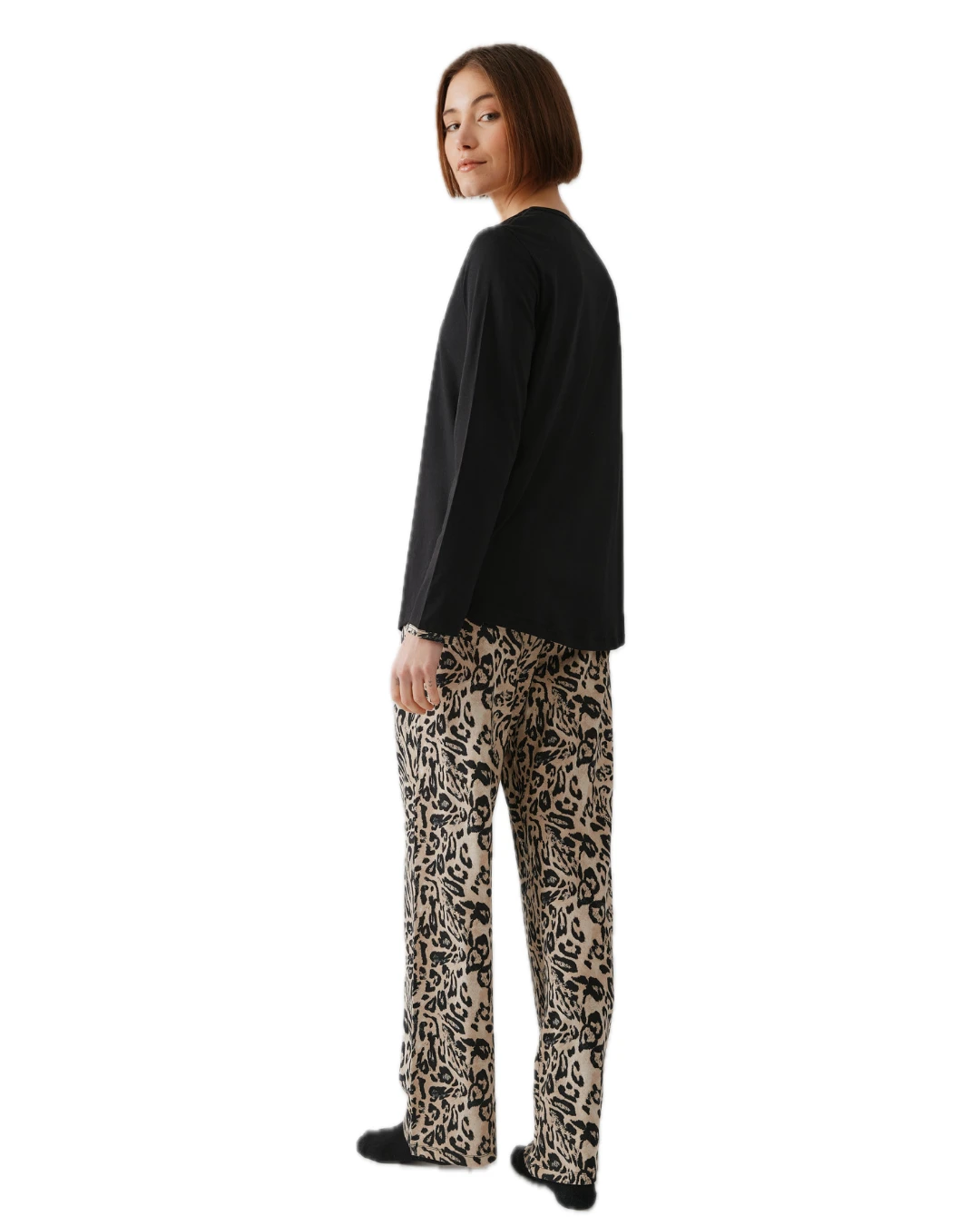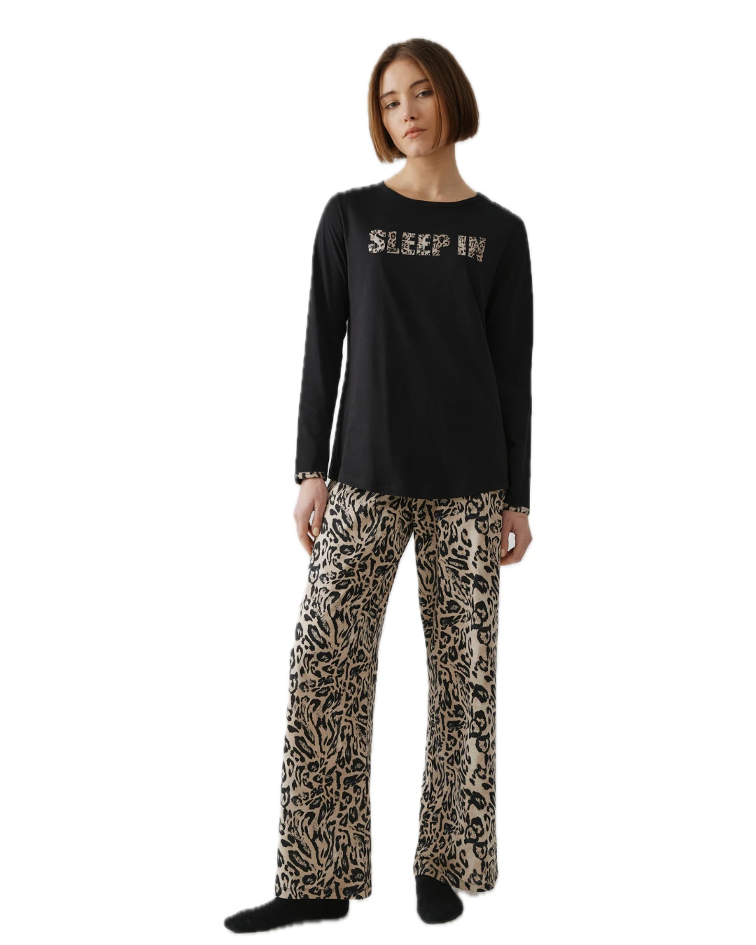 Xειμερινή πιτζάμα από μοντάλ και βαμβάκι υψηλής ποιότητας. Το σετ περιλαμβάνει μακρυμάνικη μπλούζα με τύπωμα στο στήθος και παντελόνι τυπωμένο all over, με ίσιο τελείωμα.