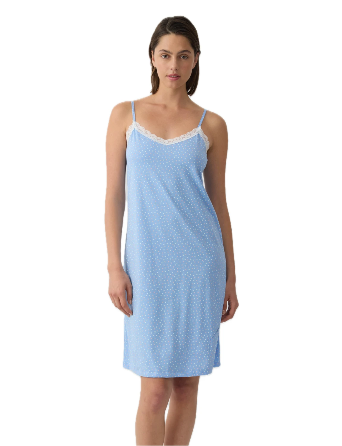 Νυχτικό με λεπτές μπριτέλες από βαμβακερό ύφασμα εξαιρετικής ποιότητας που προσφέρει απαλότητα και δροσερή αίσθηση κατά τη διάρκεια της νύχτας. Διαθέτει διακριτικό all over τύπωμα και κομψή λεπτομέρεια δαντέλας στο ντεκολτέ που χαρίζει θηλυκό χαρακτήρα