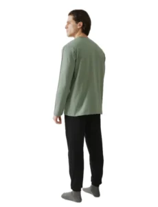 Ανδρική πιτζάμα plus size από βαμβακερό ύφασμα υψηλής ποιότητας. Αποτελείται από μακρυμάνικη μονόχρωμη μπλούζα με στρόγγυλη λαιμόκοψη και τύπωμα μπροστά και μονόχρωμο παντελόνι με μπάσκα στο τελείωμα.