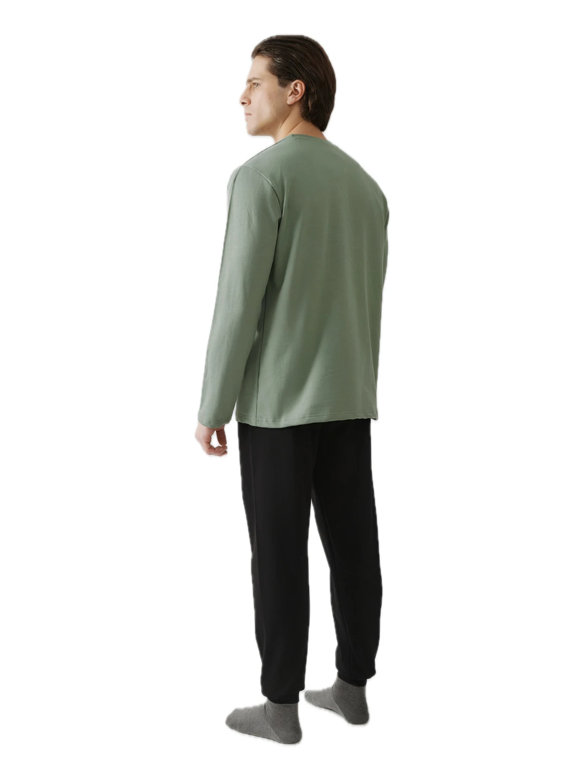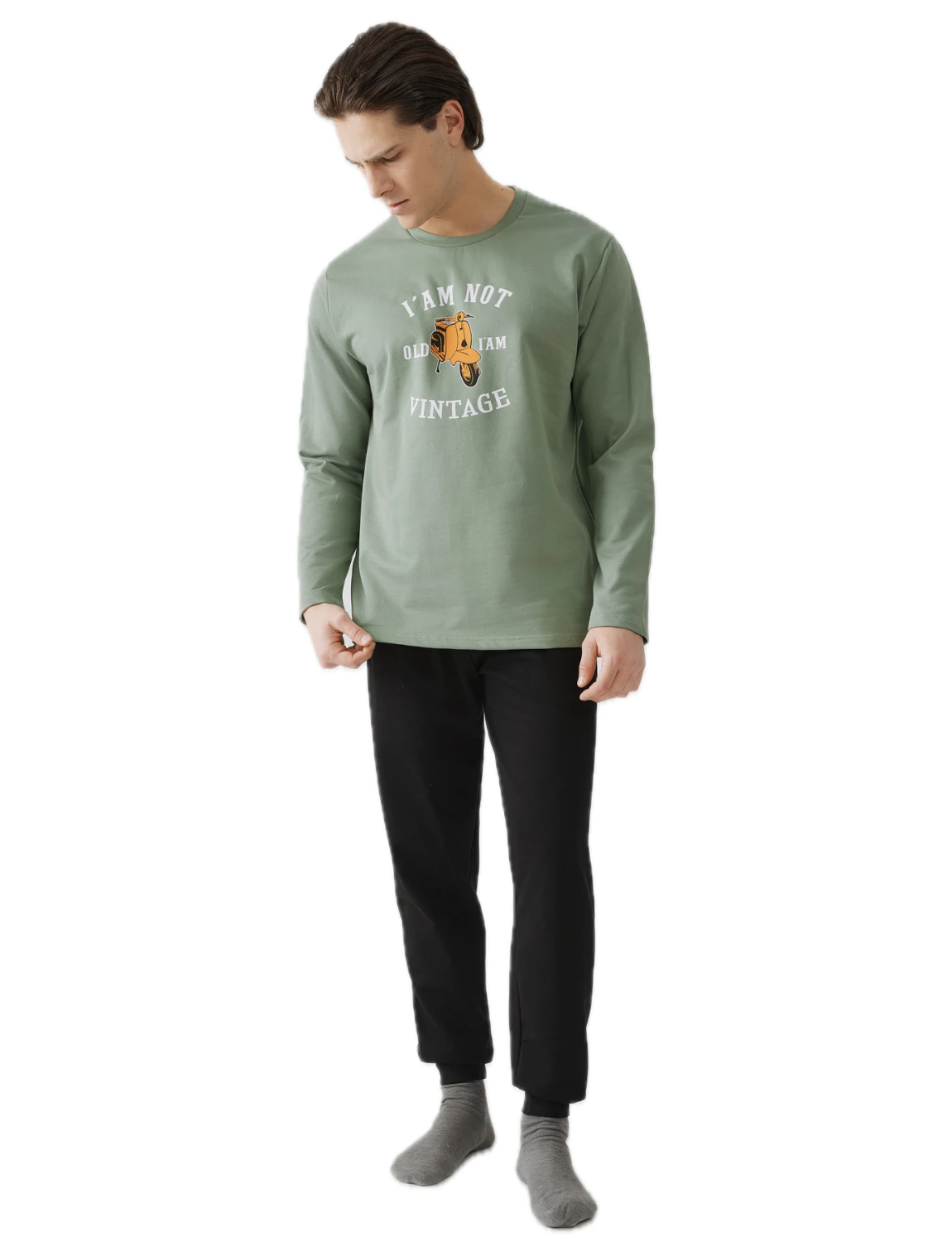 Ανδρική πιτζάμα plus size από βαμβακερό ύφασμα υψηλής ποιότητας. Αποτελείται από μακρυμάνικη μονόχρωμη μπλούζα με στρόγγυλη λαιμόκοψη και τύπωμα μπροστά και μονόχρωμο παντελόνι με μπάσκα στο τελείωμα.
