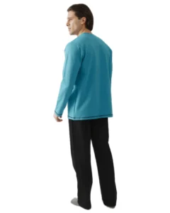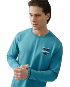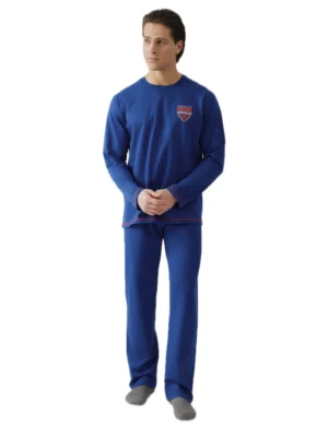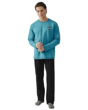 Ανδρική πιτζάμα plus size από βαμβακερό ύφασμα φούτερ υψηλής ποιότητας. Αποτελείται από μακρυμάνικη μονόχρωμη μπλούζα με στρόγγυλη λαιμόκοψη και τύπωμα και μονόχρωμο παντελόνι με ίσιο τελείωμα.