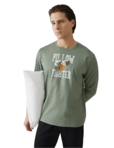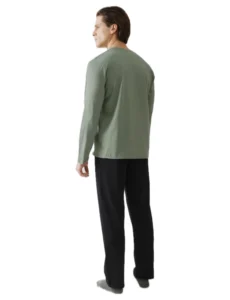 Ανδρική πιτζάμα plus size από βαμβακερό ύφασμα υψηλής ποιότητας. Αποτελείται από μακρυμάνικη μονόχρωμη μπλούζα με στρόγγυλη λαιμόκοψη και τύπωμα μπροστά και μονόχρωμο παντελόνι με ίσιο τελείωμα.