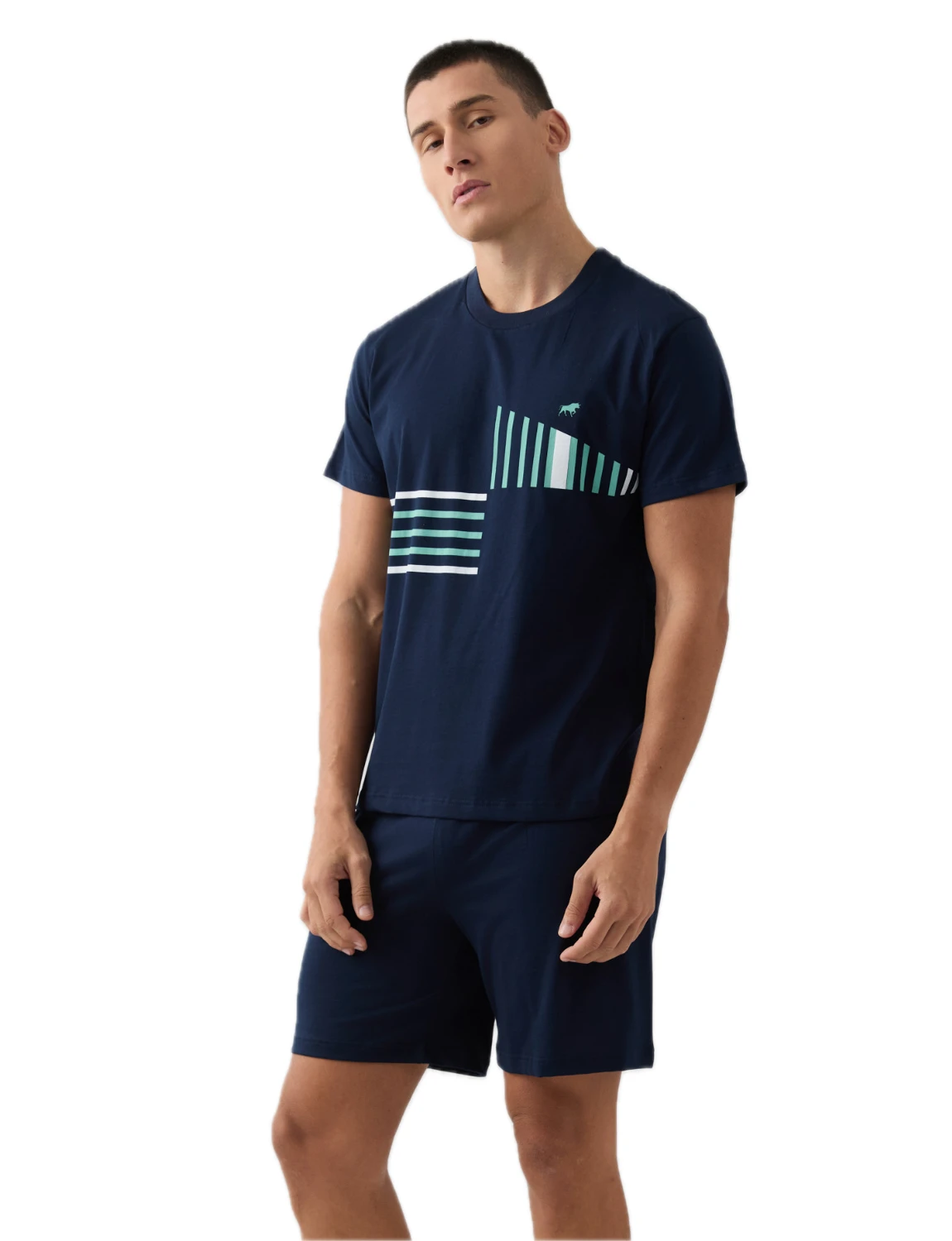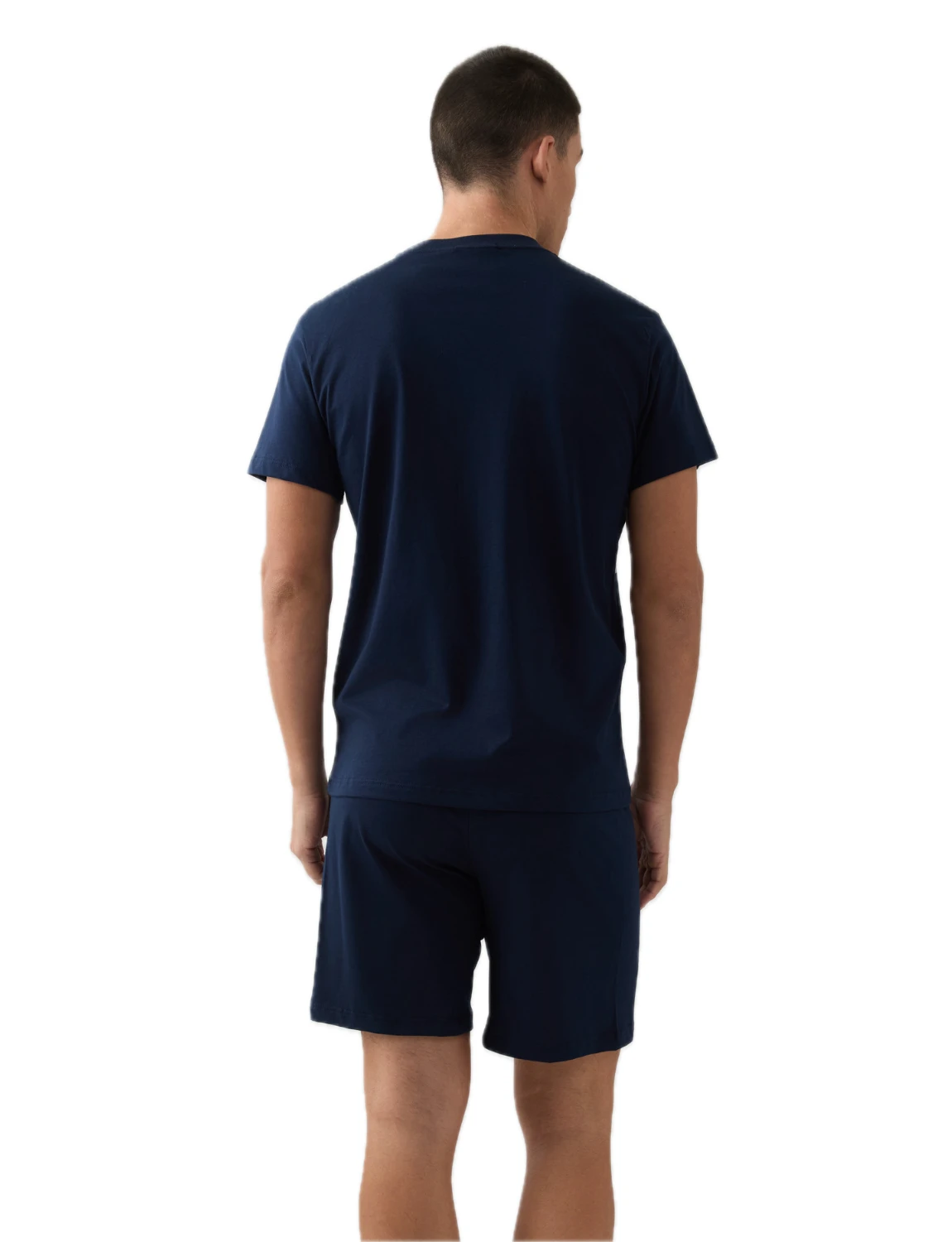 Ανδρικό σετ πιτζάμας slim fit από βαμβάκι εξαιρετικής ποιότητας, ιδανικό για άνετο και δροσερό ύπνο. Το σετ αποτελείται από κοντομάνικο τοπ με στρογγυλή λαιμόκοψη και άνετο σορτς, προσφέροντας μοντέρνα εφαρμογή και ελευθερία κινήσεων