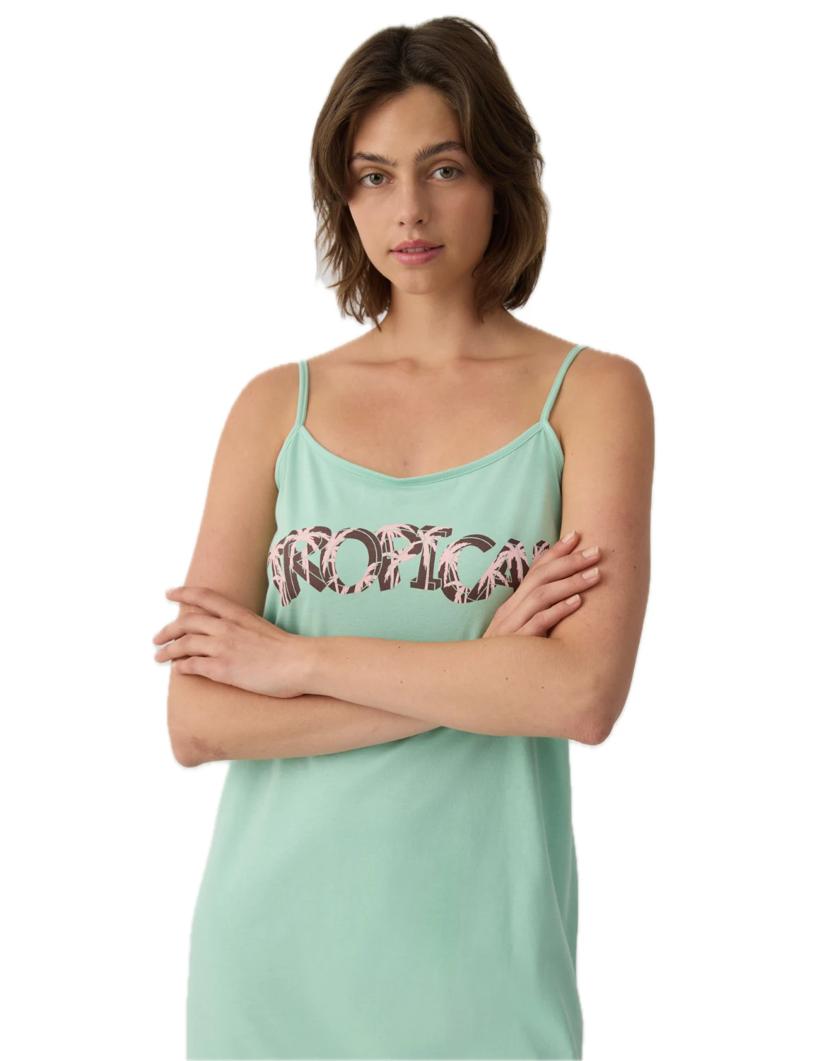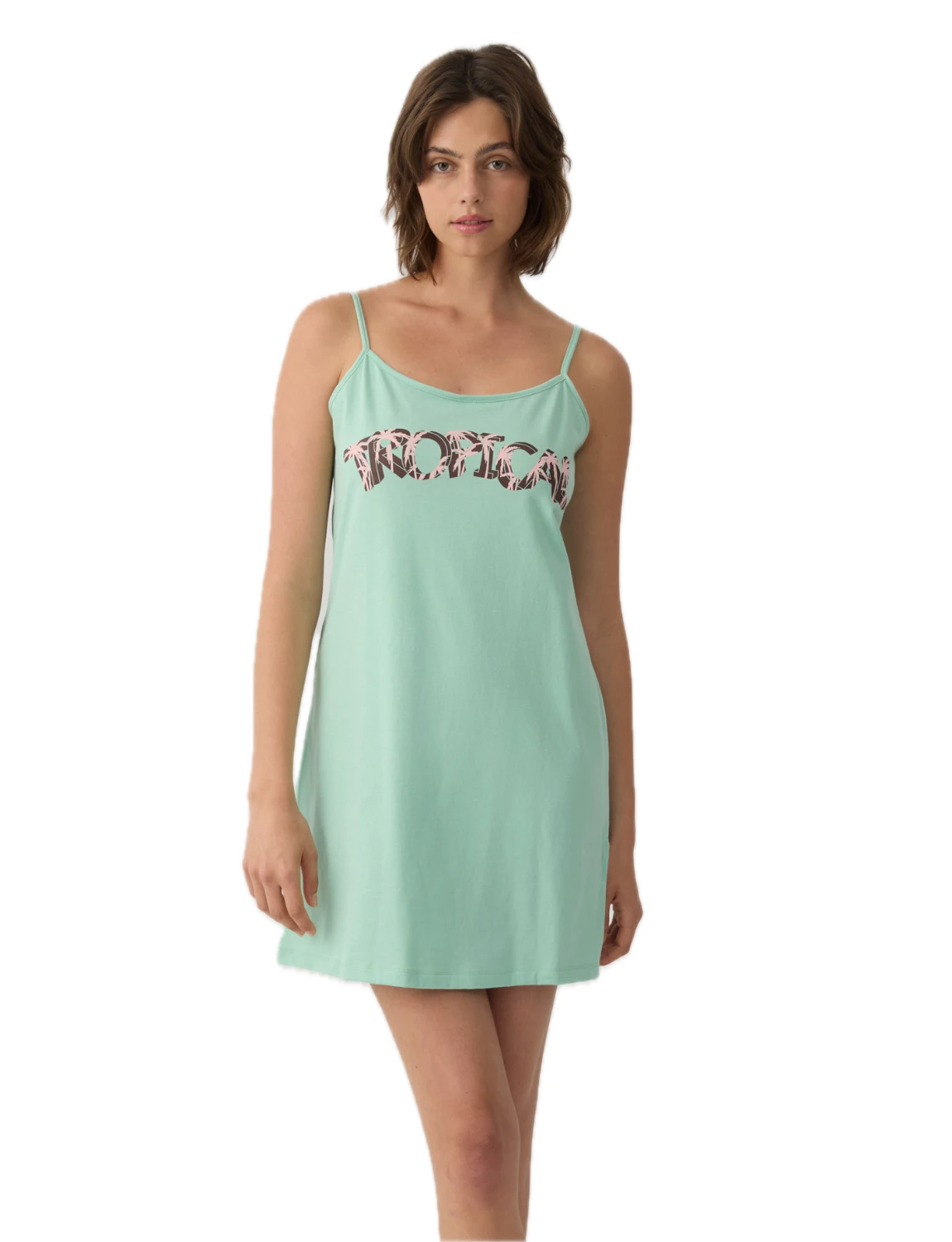 Κοντό νυχτικό με λεπτές μπριτέλες και διακοσμητικό τύπωμα στο στήθος που προσθέτει μοντέρνα και καλοκαιρινή πινελιά. Κατασκευασμένη από 100% βαμβάκι εξαιρετικής ποιότητας, προσφέρει απαλή αίσθηση, δροσερή εφαρμογή και άνεση καθ’ όλη τη διάρκεια της νύχτας.