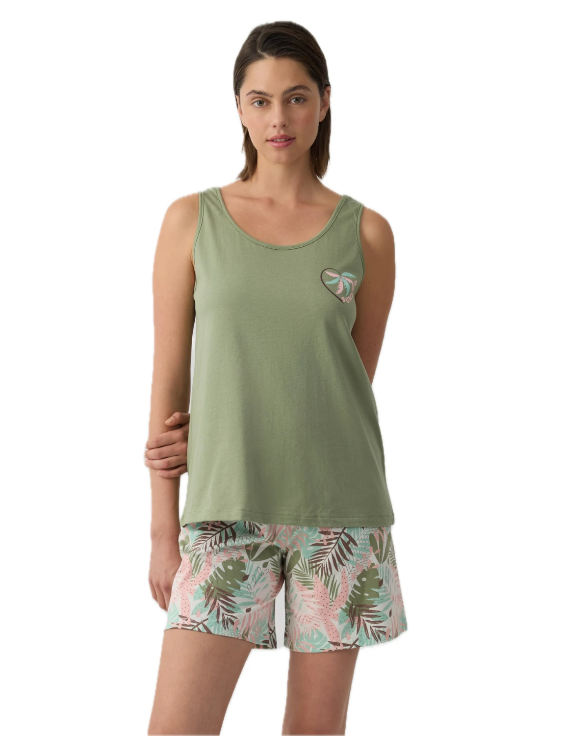 Σετ πιτζάμας από βαμβακερό ύφασμα εξαιρετικής ποιότητας που προσφέρει απαλή αίσθηση και δροσερή άνεση. Το σετ αποτελείται από αμάνικο τοπ με διακριτικό διακοσμητικό τύπωμα στο στήθος και κοντό εμπριμέ σορτς με ελαστική μέση για άνετη εφαρμογή. Η ανάλαφρη υφή του υφάσματος και η άνετη γραμμή το καθιστούν ιδανικό για ξεκούραστο ύπνο και χαλαρές καλοκαιρινές στιγμές στο σπίτι.