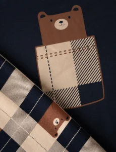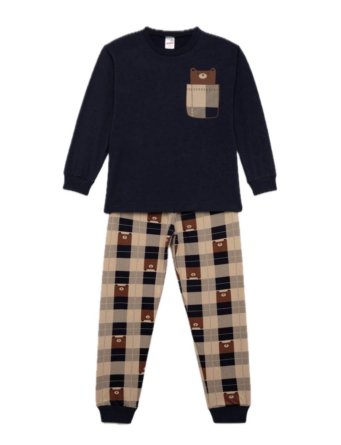 Παιδική unisex πιτζάμα Minerva, κατασκευασμένη από βαμβακερό ύφασμα υψηλής ποιότητας. Αποτελείται από μονόχρωμη μακρυμάνικη μπλούζα με στρόγγυλη λαιμόκοψη και τύπωμα στο στήθος και καρό παντελόνι με μπάσκα στο τελείωμα.