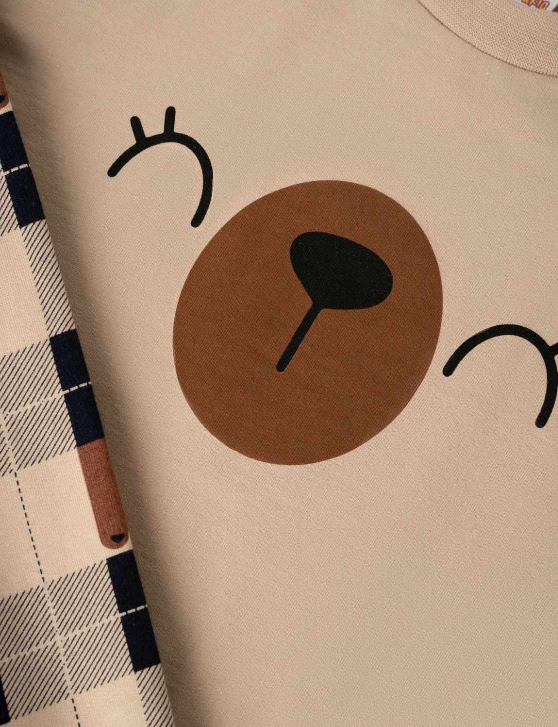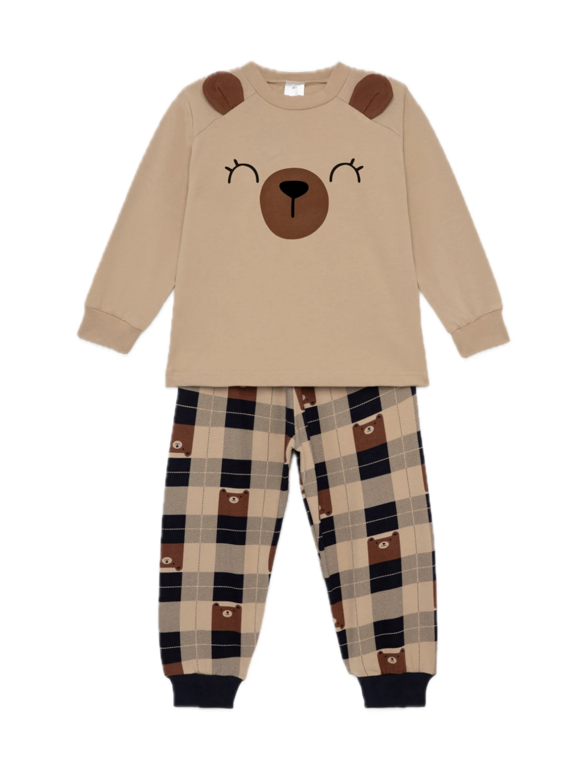 Βρεφική unisex πιτζάμα Minerva, κατασκευασμένη από βαμβακερό ύφασμα υψηλής ποιότητας. Αποτελείται από μονόχρωμη μακρυμάνικη μπλούζα με στρόγγυλη λαιμόκοψη και τύπωμα στο στήθος και καρό παντελόνι με μπάσκα στο τελείωμα.