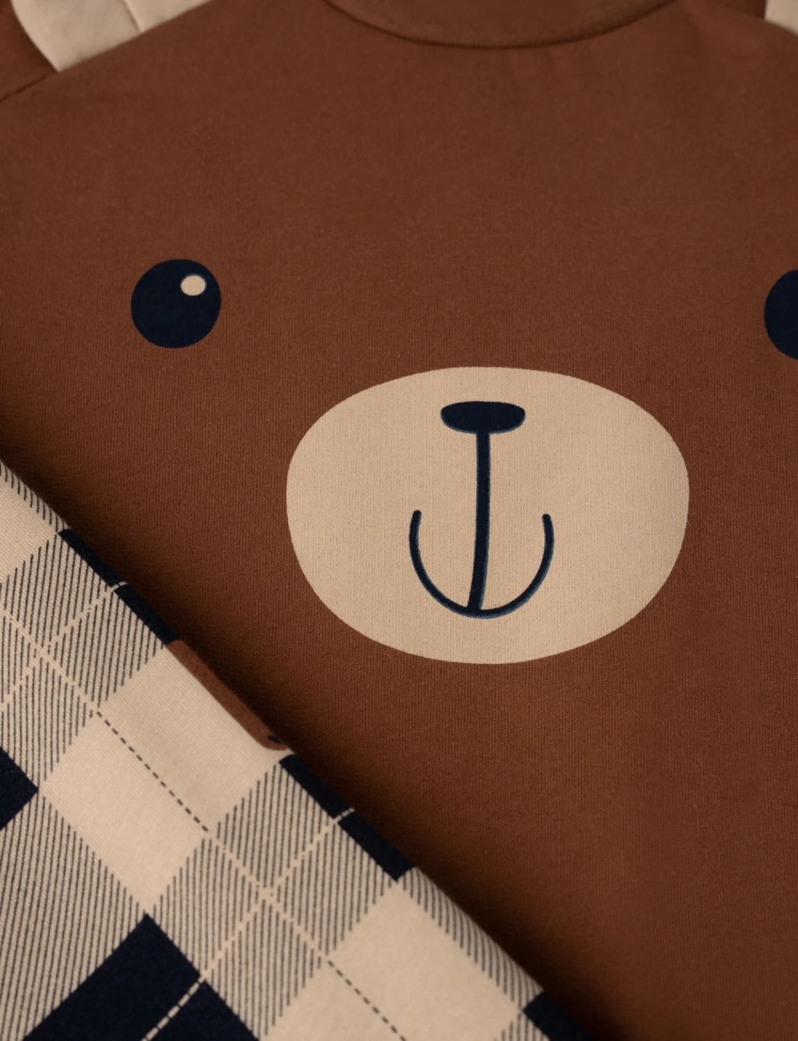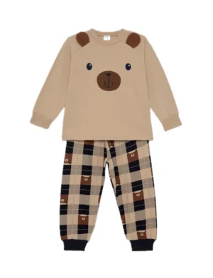 Βρεφική unisex πιτζάμα Minerva, κατασκευασμένη από βαμβακερό ύφασμα υψηλής ποιότητας. Αποτελείται από μονόχρωμη μακρυμάνικη μπλούζα με στρόγγυλη λαιμόκοψη και τύπωμα στο στήθος και καρό παντελόνι με μπάσκα στο τελείωμα.