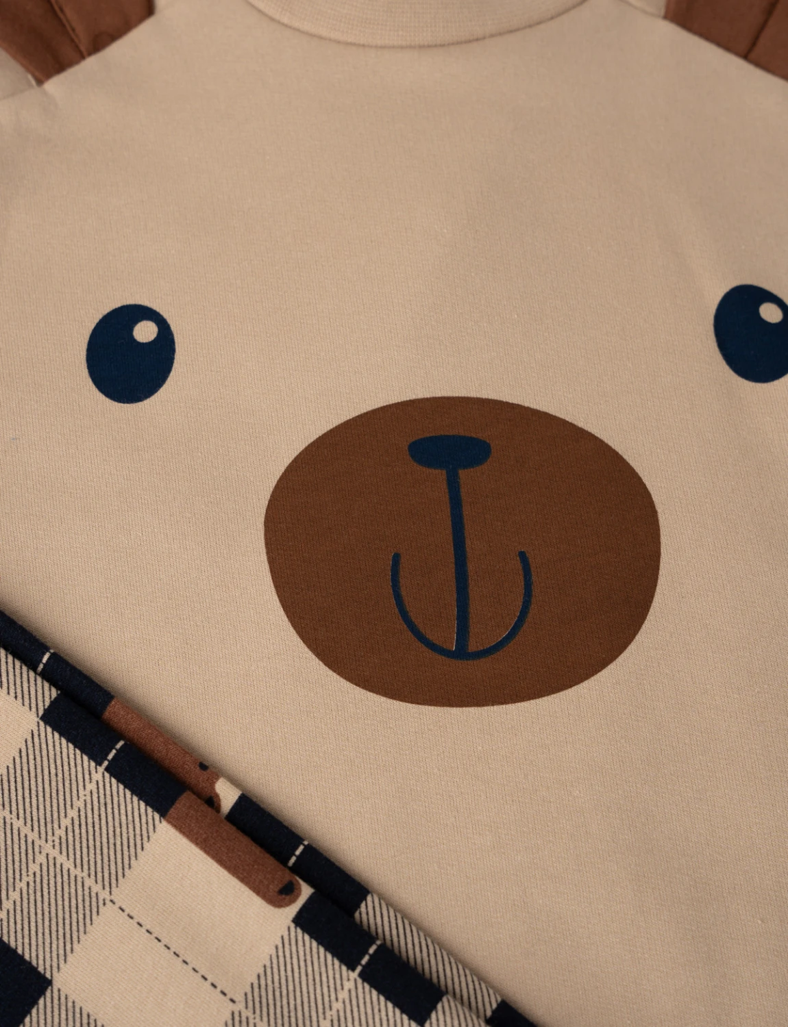 Βρεφική unisex πιτζάμα Minerva, κατασκευασμένη από βαμβακερό ύφασμα υψηλής ποιότητας. Αποτελείται από μονόχρωμη μακρυμάνικη μπλούζα με στρόγγυλη λαιμόκοψη και τύπωμα στο στήθος και καρό παντελόνι με μπάσκα στο τελείωμα.