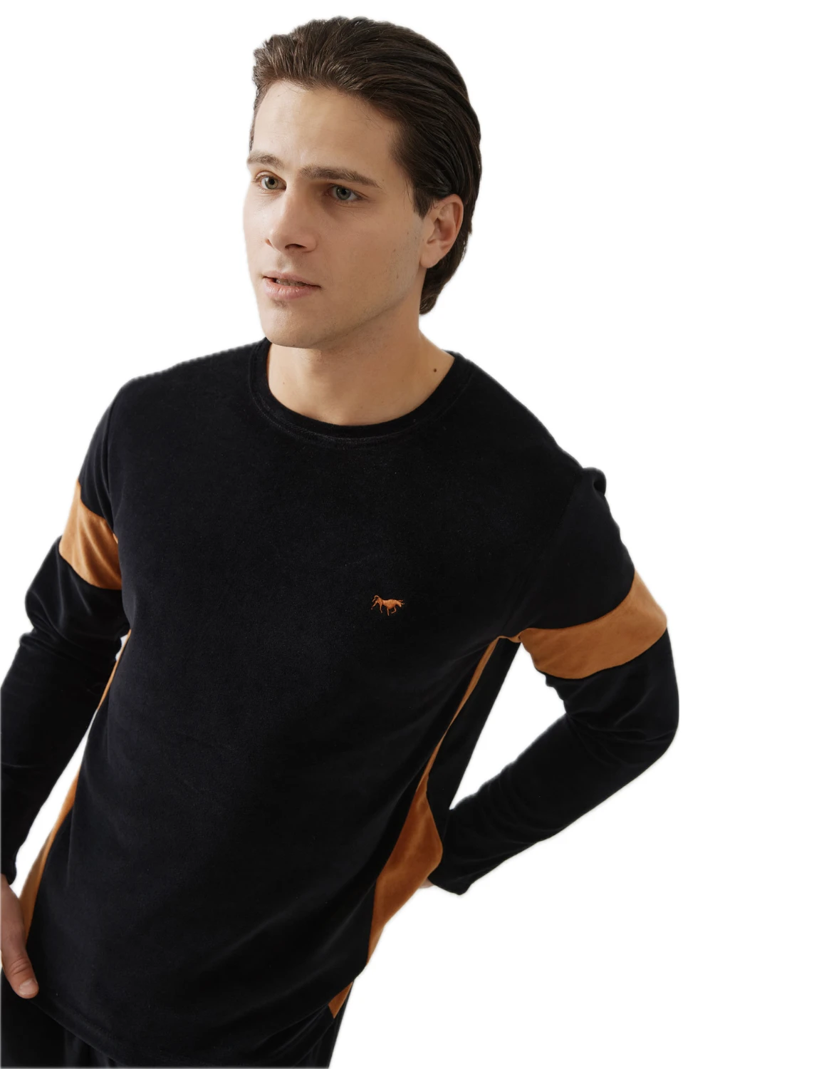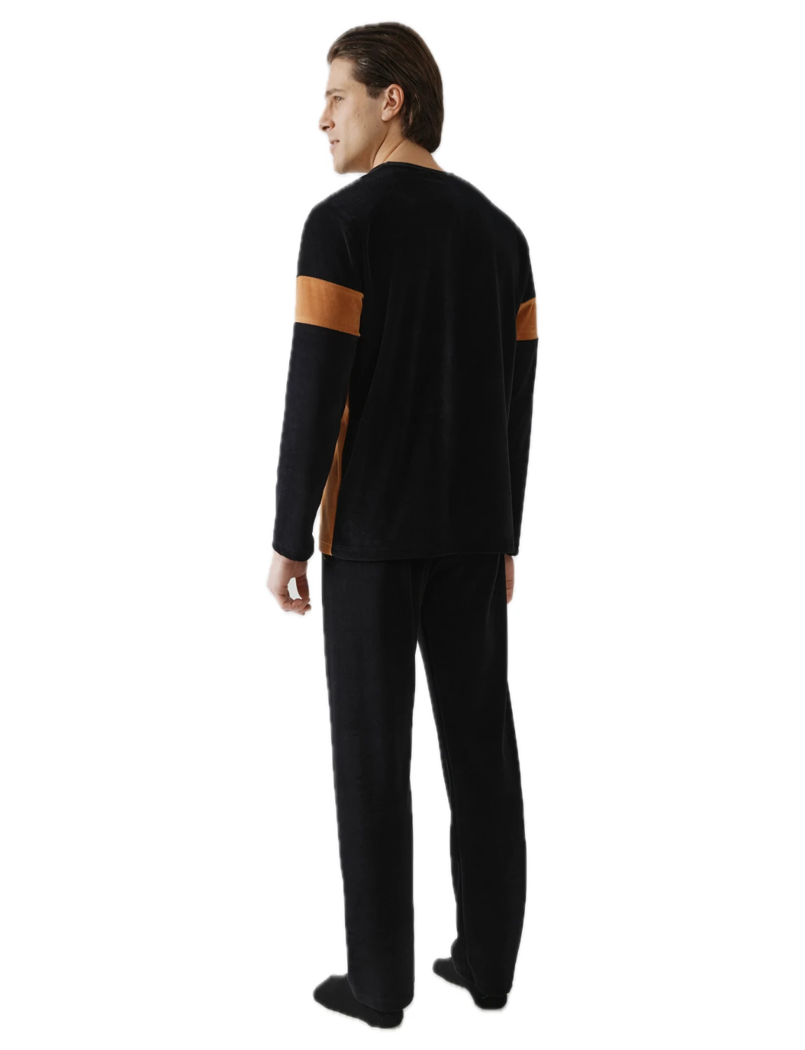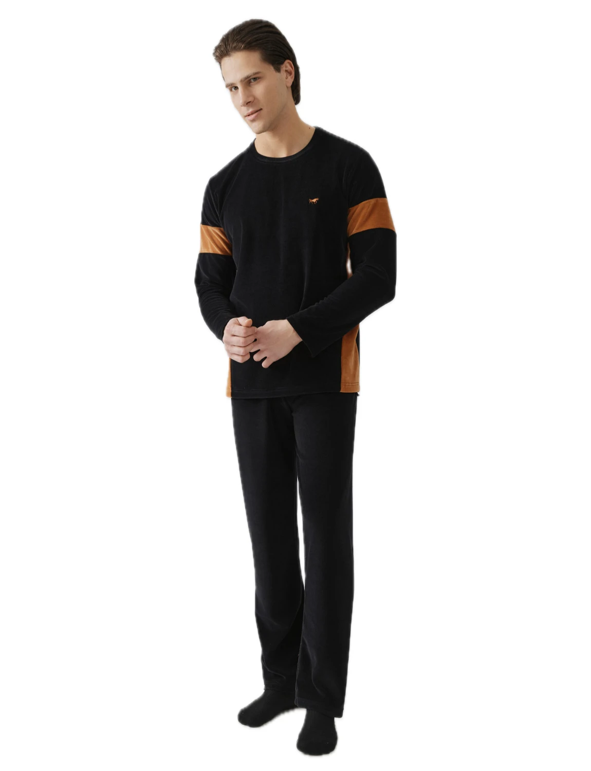 Ανδρική πιτζάμα βελούδινη υψηλής ποιότητας. To σετ περιλαμβάνει μπλούζα με στρογγυλή λαιμόκοψη και παντελόνι ίσιο.