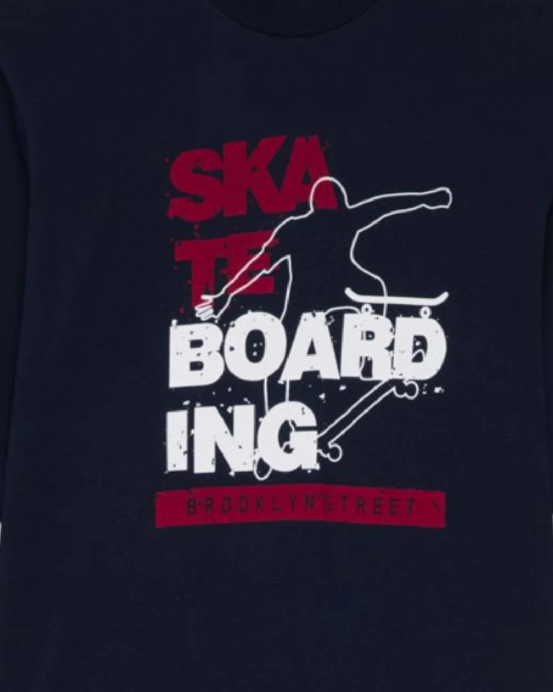 Εφηβική χειμερινή πιτζάμα από βαμβακερό ύφασμα, υψηλής ποιότητας. Το σετ περιλαμβάνει μακρυμάνικη μονόχρωμη μπλούζα με στρογγυλή λαιμόκοψη και τύπωμα στο στήθος και μονόχρωμο παντελόνι με μαλακό λάστιχο στο τελείωμα.