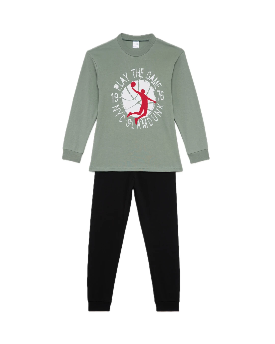 Παιδική χειμερινή πιτζάμα από βαμβακερό ύφασμα, υψηλής ποιότητας. Το σετ περιλαμβάνει μακρυμάνικη μονόχρωμη μπλούζα με στρογγυλή λαιμόκοψη και τύπωμα και μονόχρωμο παντελόνι με μαλακό λάστιχο στο τελειώμα.