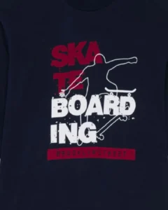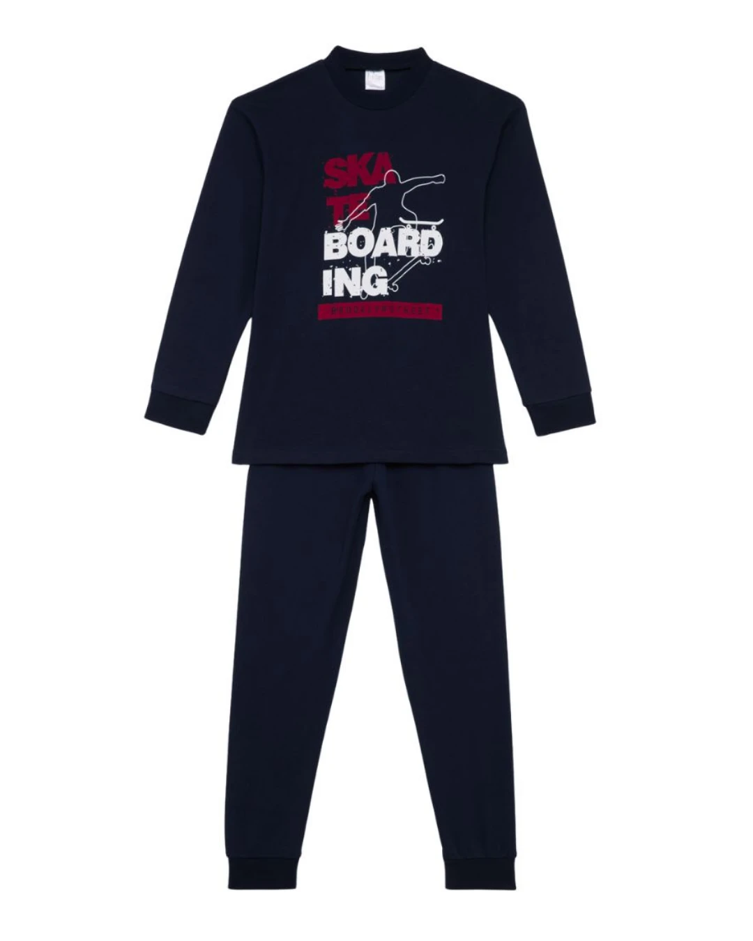 Παιδική χειμερινή πιτζάμα από βαμβακερό ύφασμα, υψηλής ποιότητας. Το σετ περιλαμβάνει μακρυμάνικη μονόχρωμη μπλούζα με στρογγυλή λαιμόκοψη και τύπωμα στο στήθος και μονόχρωμο παντελόνι με μαλακό λάστιχο στο τελείωμα.