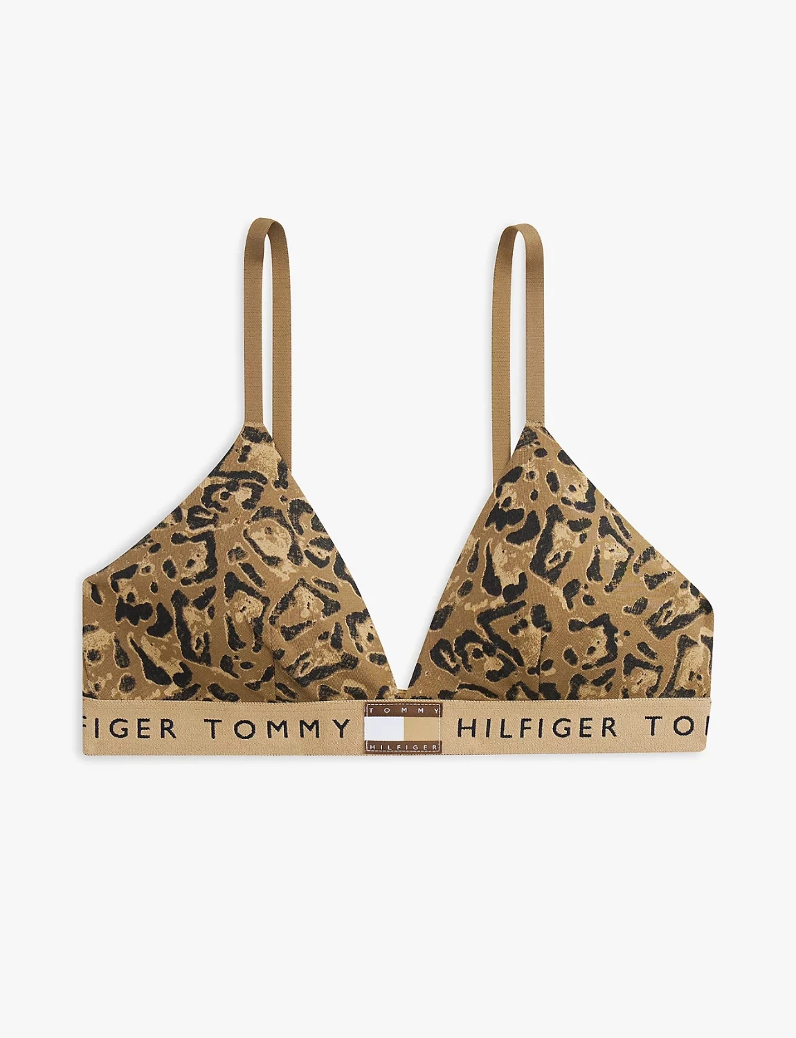 Tommy Hilfiger γυναικείο bralette με λεοπάρ σχέδιο και καφέ φαρδύ λάστιχο. Διαθέτει ρυθμιζόμενες τιράντες και αφαιρούμενη επένδυση.