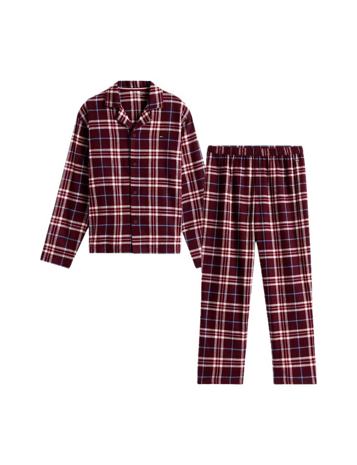 Χειμερινή πιτζάμα από βαμβακερό ύφασμα, υψηλής ποιότητας. Το σετ περιλαμβάνει καρό μπλούζα με κουμπιά και γιακά σε στυλ πουκάμισο, με κέντημα σημαίας Tommy Hilfiger στο στήθος και ίσιο καρό παντελόνι με λάστιχο στη μέση.