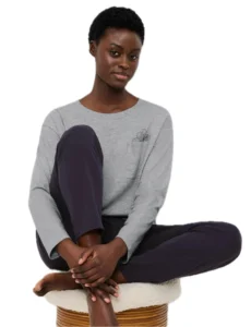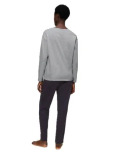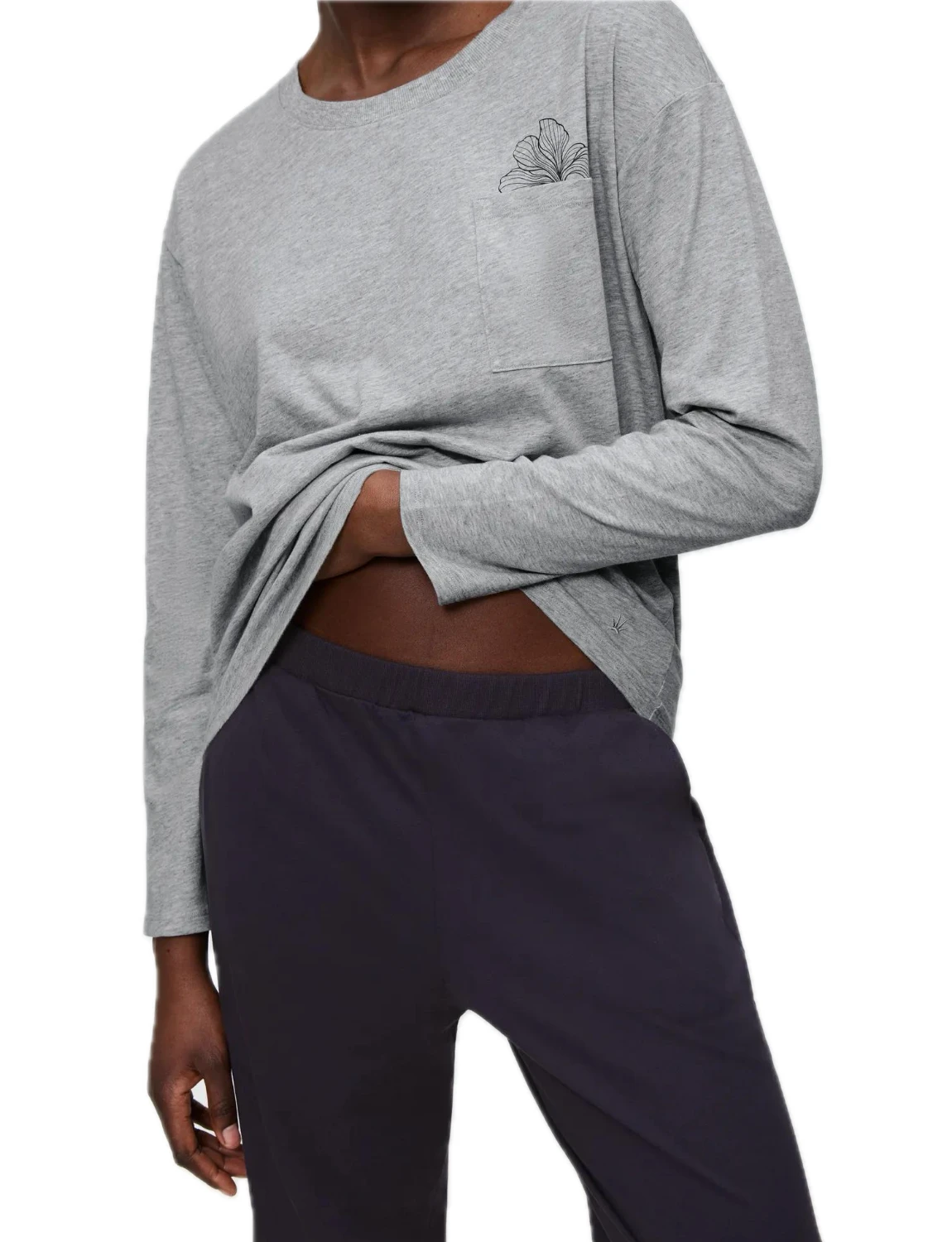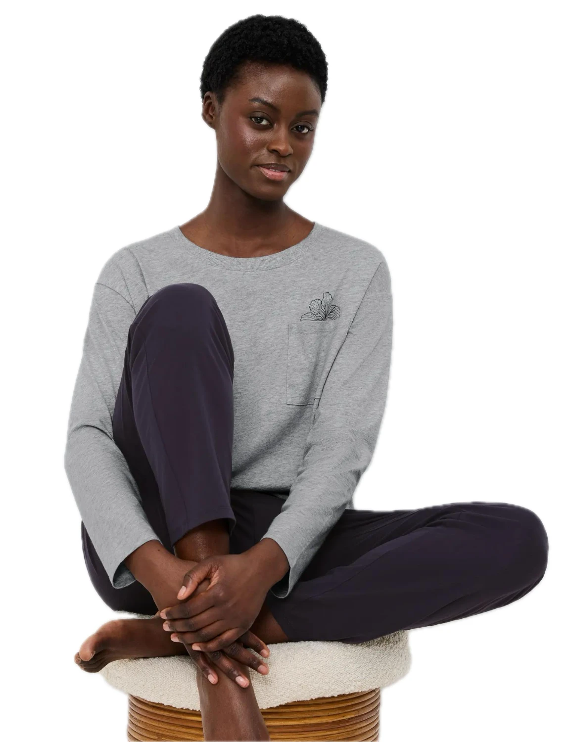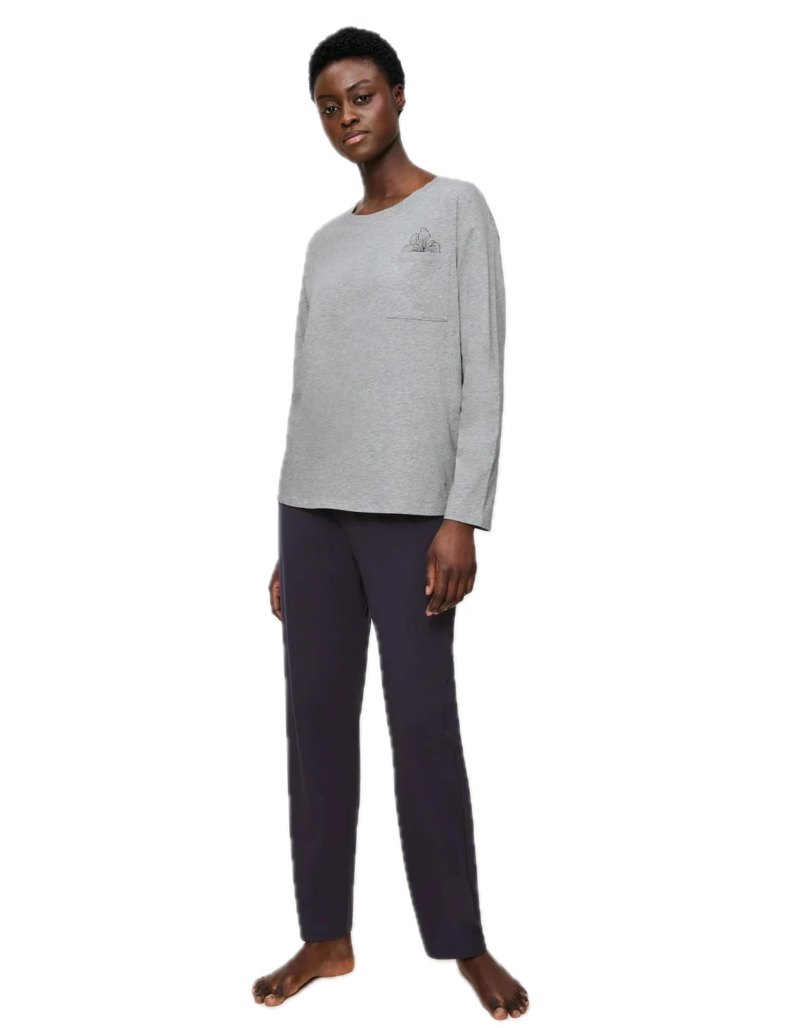 Γυναικείο, άνετο σετ πιτζάμας. Το σετ αποτελείται από μονόχρωμη μακρυμάνικη μπλούζα με ριμπ λαιμόκοψη, σχέδιο και τσεπάκι στη μια πλευρά και παντελόνι σε ίσια γραμμή, με πλαϊνές τσέπες και ελαστική μέση.